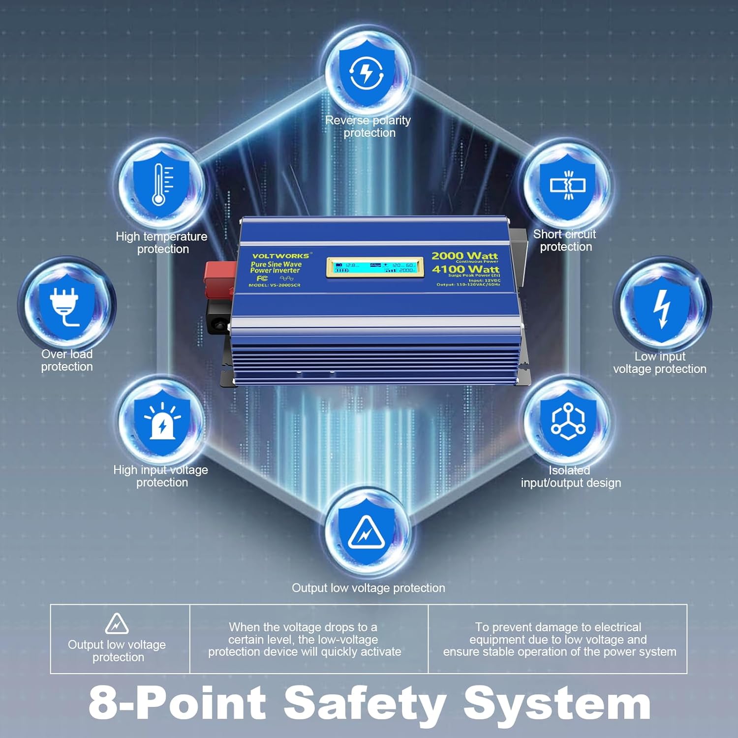 - 【Upgraded 8 Advanced Protections】2000 watt inverter pure sine wave including Reverse polarity protection, Input over-voltage/under-voltage protection, Output short-circuit protection, Over-load protection, Over-temperature protection, Low-input alarm. And 2025 upgraded Low-Output Voltage Protection also provide more stable voltage protection to your loads.