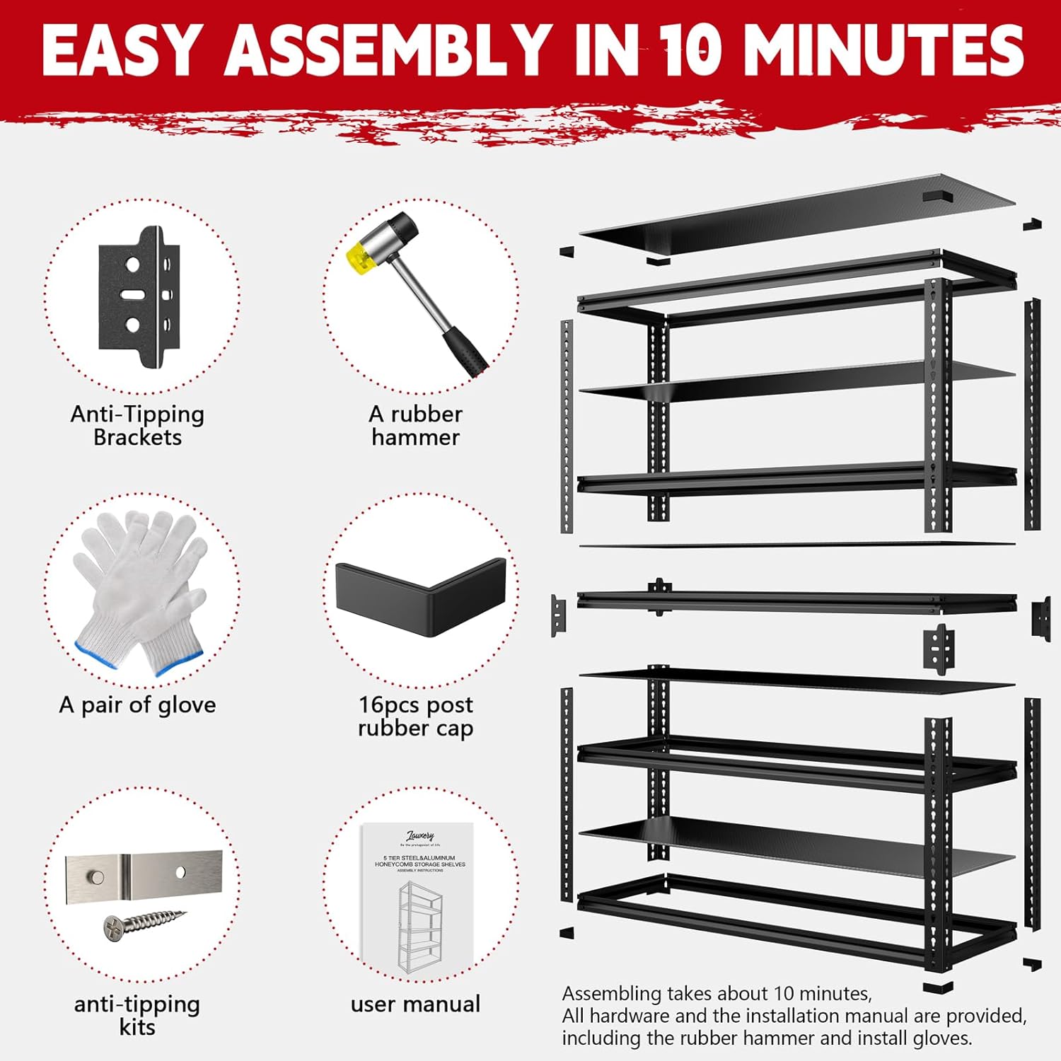 - Easy Set-up Boltless Shelving: No more struggling with confusing instructions and fiddly screws or bolts. This metal storage shelf for the garage features a unique interlocking design that makes assembly a breeze. Just slide and secure the frame into the post hole. Comes complete with all the essential accessories – a hammer, gloves, anti-dumping kits, and more. You'll have it set up in minutes. Get organized easily with our hassle-free boltless shelving.