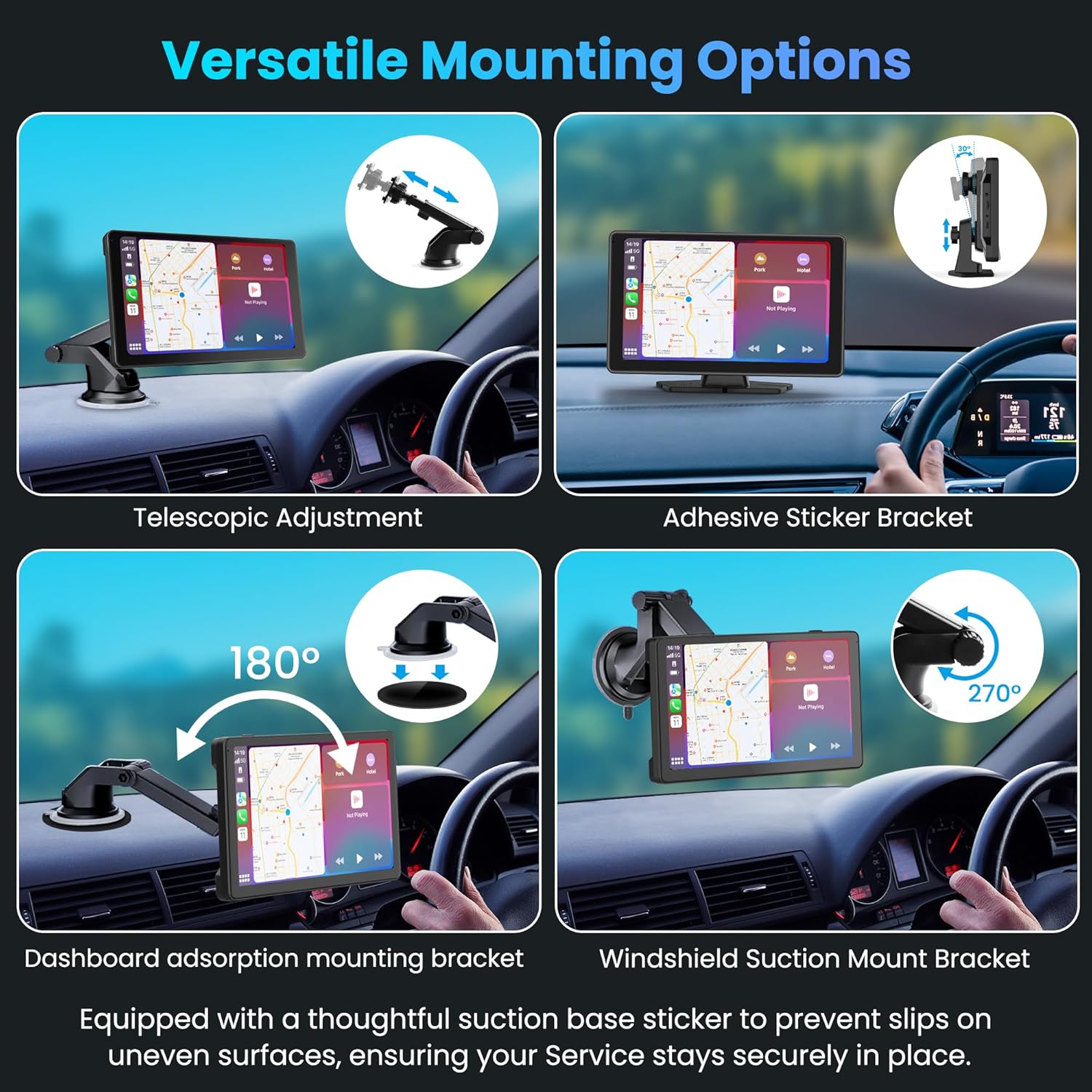 - 【Secure Mounting for All Vehicle Types】 Designed for 12-24V vehicles, our device fits a wide range of cars, trucks, RVs, and vans without the need to disassemble your console or alter your original radio. Equipped with two versatile mounting options, including a secure suction mount with an added adhesive base for enhanced stability on uneven surfaces, it ensures your screen stays firmly in place for a hassle-fre.e experience.