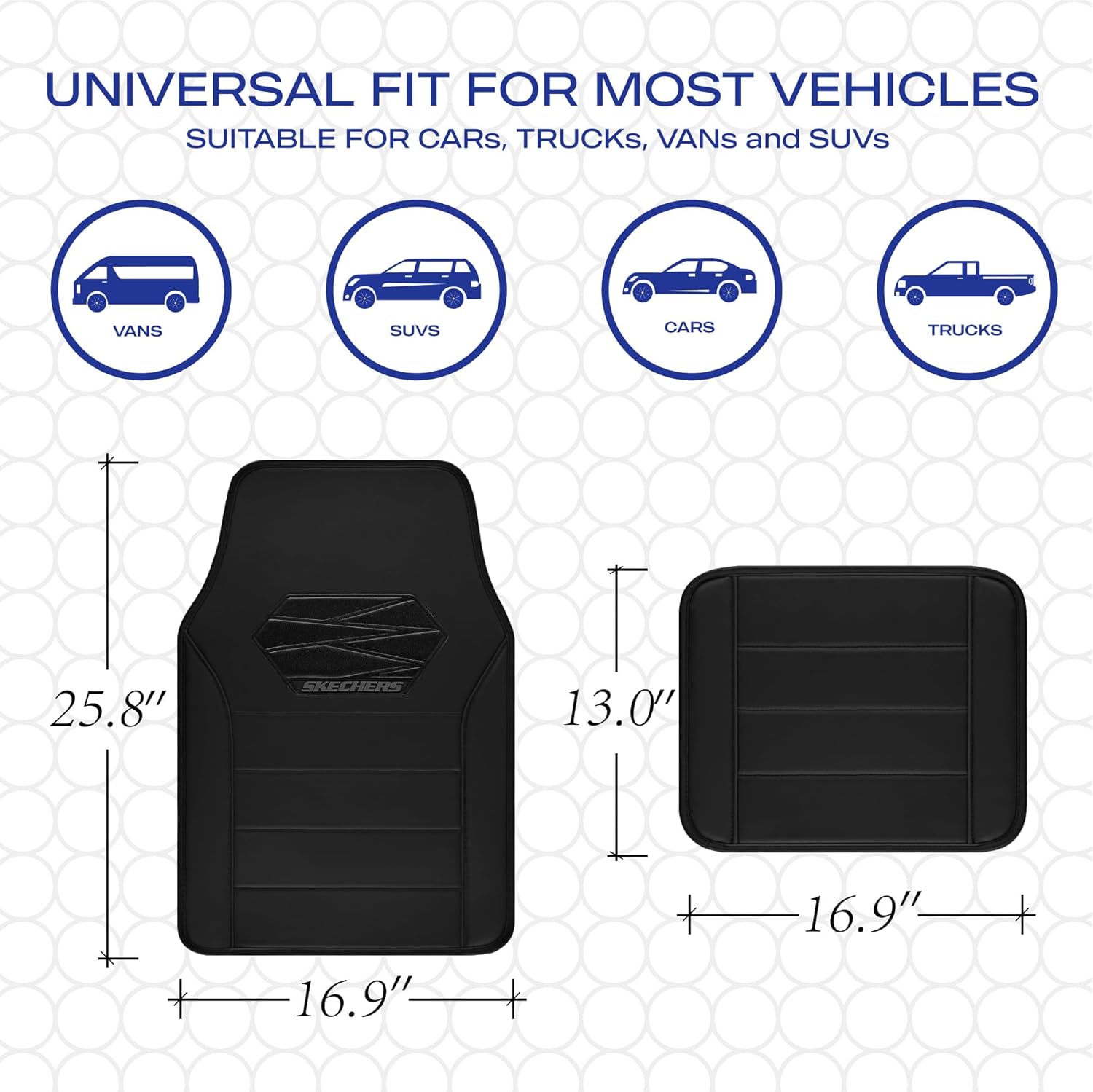 - UNIVERSAL FIT-Skechers car mats Designed to fit most SUVs,vans,sedans,and trucks, This full set includes 4 floor mats,Front piece: 25.8 Ă— 16.9 inches,Back piece: 13Ă— 16.9 inches, providing comprehensive coverage for both front and rear seats, giving your entire vehicle floor the protection it needs.Perfect gift for family, relatives and friends