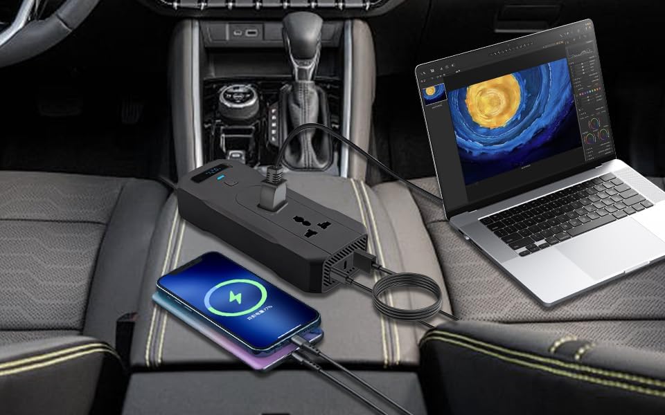- Portable and Versatile: The car inverter is only the size of a mobile phone, saving space and easy to carry.You can quickly charge your cell phone, laptops, cameras and tablets in the car at any time, and can also power other devices such as air pumps, breast pumps, car vacuum cleaners, etc.