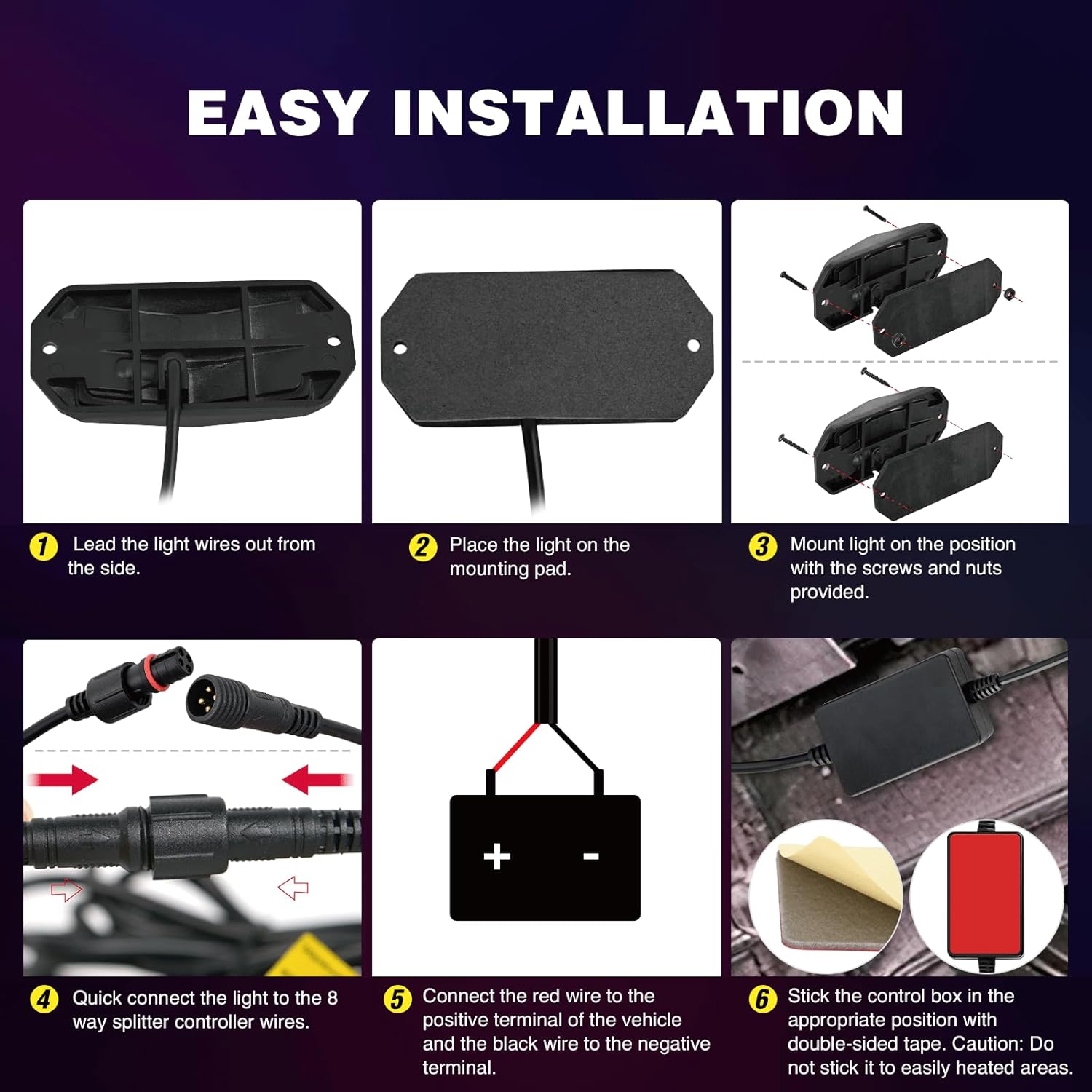 - Few Minutes To Install: Come with sponge pads and hardware. Two type of hardware suitable with different areas. Firstly, place the light on the pads, then mount lights on the position. Secondly, connect the plugs one by one. Finally connect the power wires to the power supply. Control box can stick in the appropriate position with double side tape
