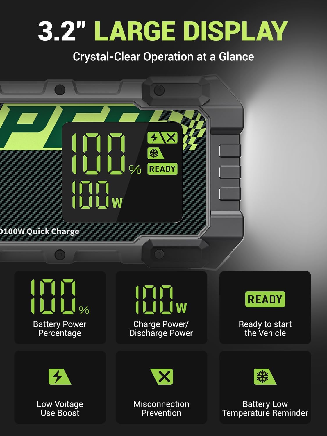 - [3.2-Inch Display & 3 Modes Lighting]- This jump box features a clear 3.2-inch display for real-time battery monitoring. It also includes a 400-lumen LED light with three modes—steady lighting, strobe, and SOS—for versatile use in any situation