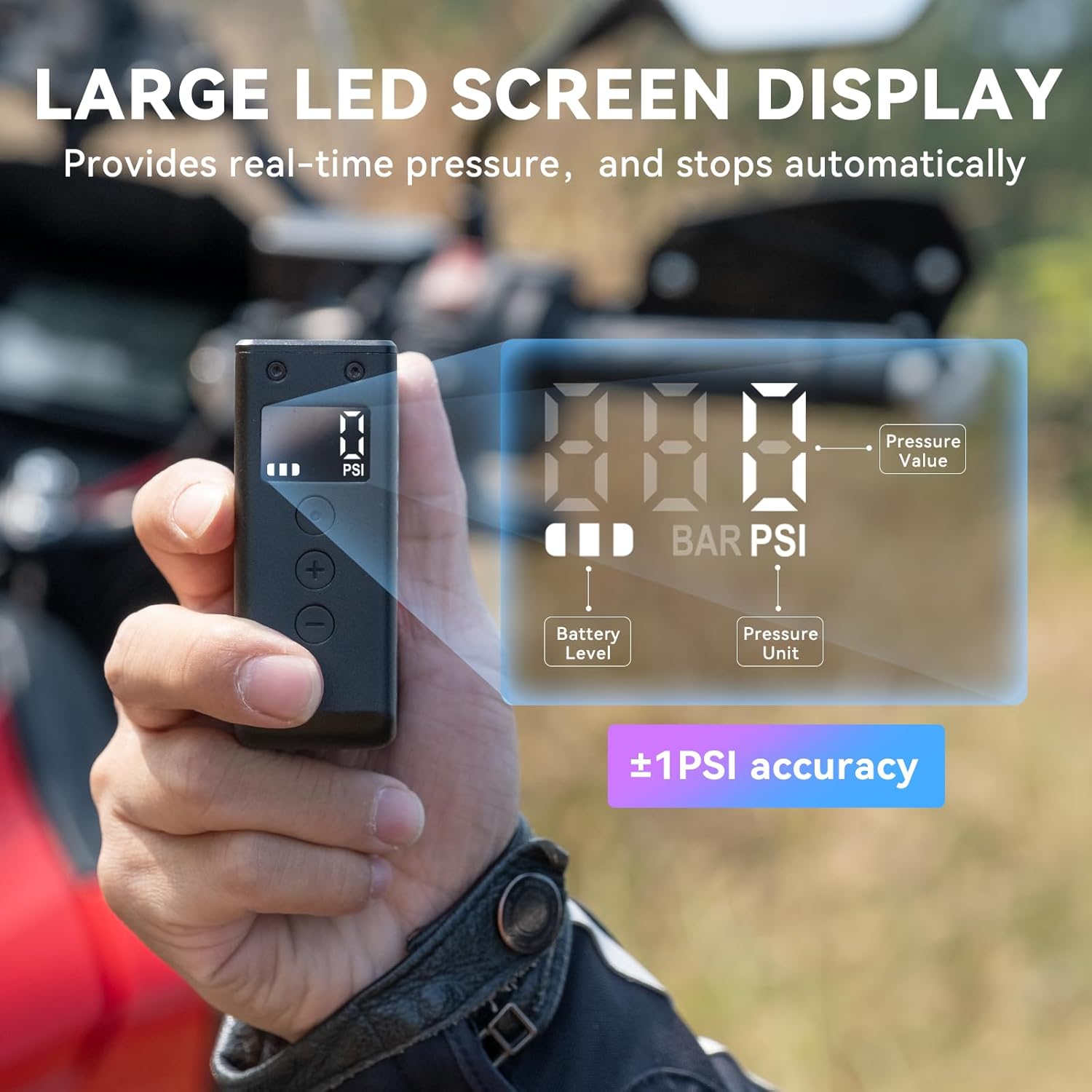 - 【Auto Shut-off】The LED large screen with pressure gauge function allows easy reading of preset pressure values and real-time pressure readings, with a measurement accuracy of ± 1 PSI. Once the desired pressure is set, this bicycle tire inflator will automatically complete the remaining tasks, stopping automatically when the target pressure is reached.
