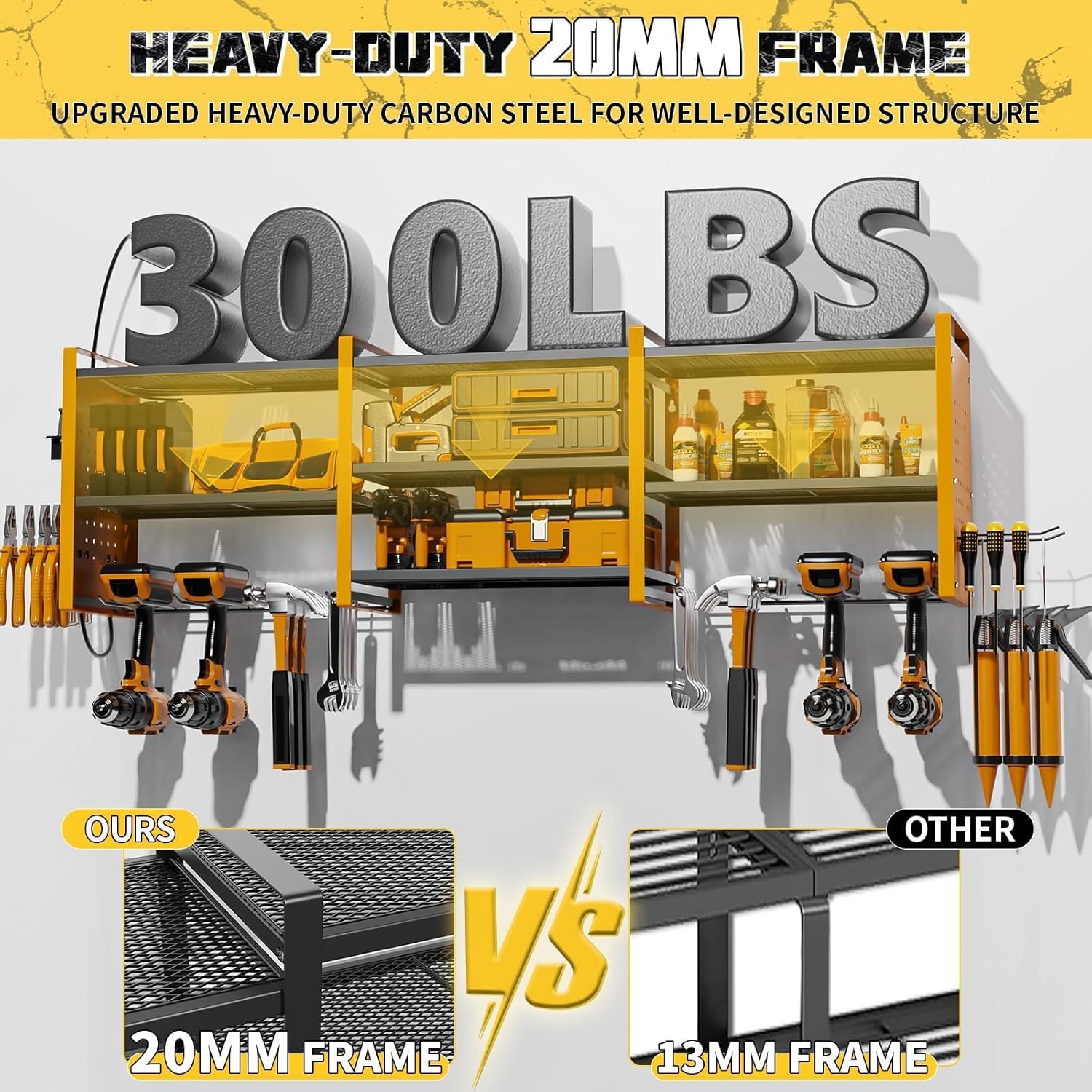 - Versatile Garage Storage Rack: The top shelf holds heavy-duty tools like electric and miter saws, while the middle and lower shelves fit medium-sized items like chargers, batteries, and toolboxes. The 5.4-inch side pegboard hooks keep hammers and screwdrivers organized and accessible. This wall-mounted garage organization saves floor space, transforming a cluttered area into an organized workspace. Note: Tools shown are for display only and are not included