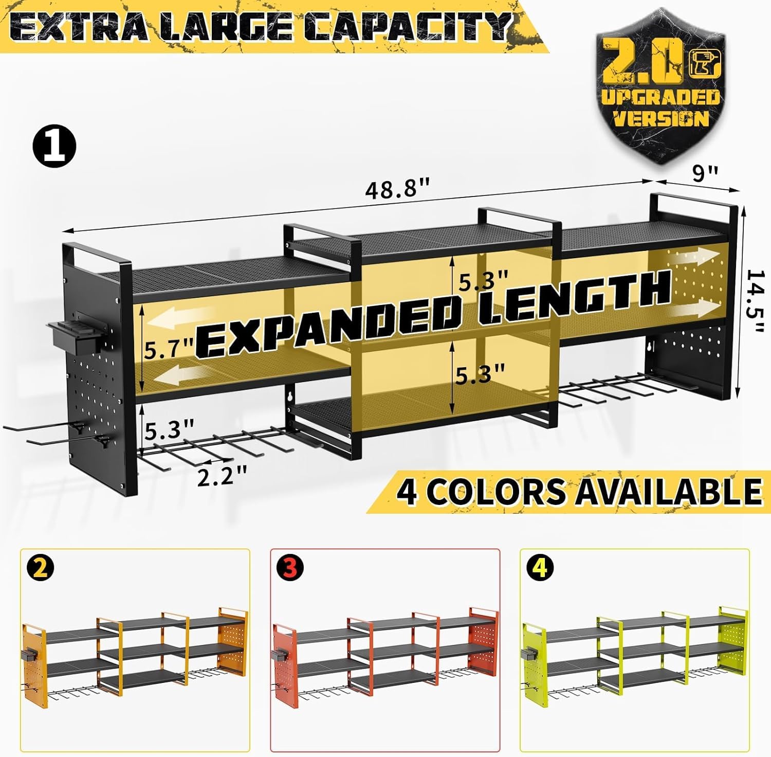 Power Tool Organizer with Charging Station Wall Mount, 3 Layer Expanded Heavy Duty Garage Organization, 48.8 Inch Length Garage Tool Storage, 4 Drill Slot, 16" Standard Hole, Black
