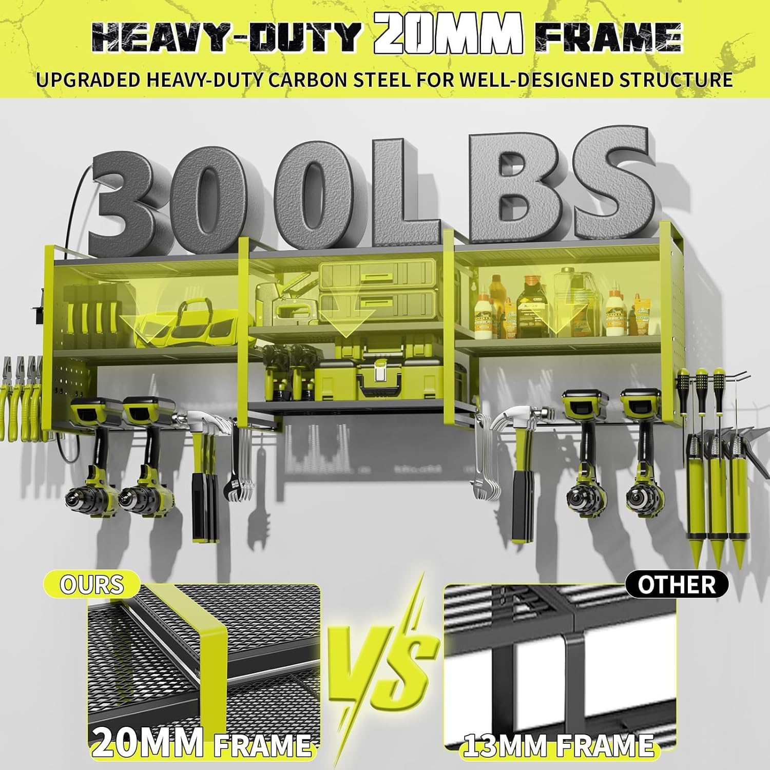 - Versatile Garage Storage Rack: The top shelf holds heavy-duty tools like electric and miter saws, while the middle and lower shelves fit medium-sized items like chargers, batteries, and toolboxes. The 5.4-inch side pegboard hooks keep hammers and screwdrivers organized and accessible. This wall-mounted garage organization saves floor space, transforming a cluttered area into an organized workspace. Note: Tools shown are for display only and are not included
