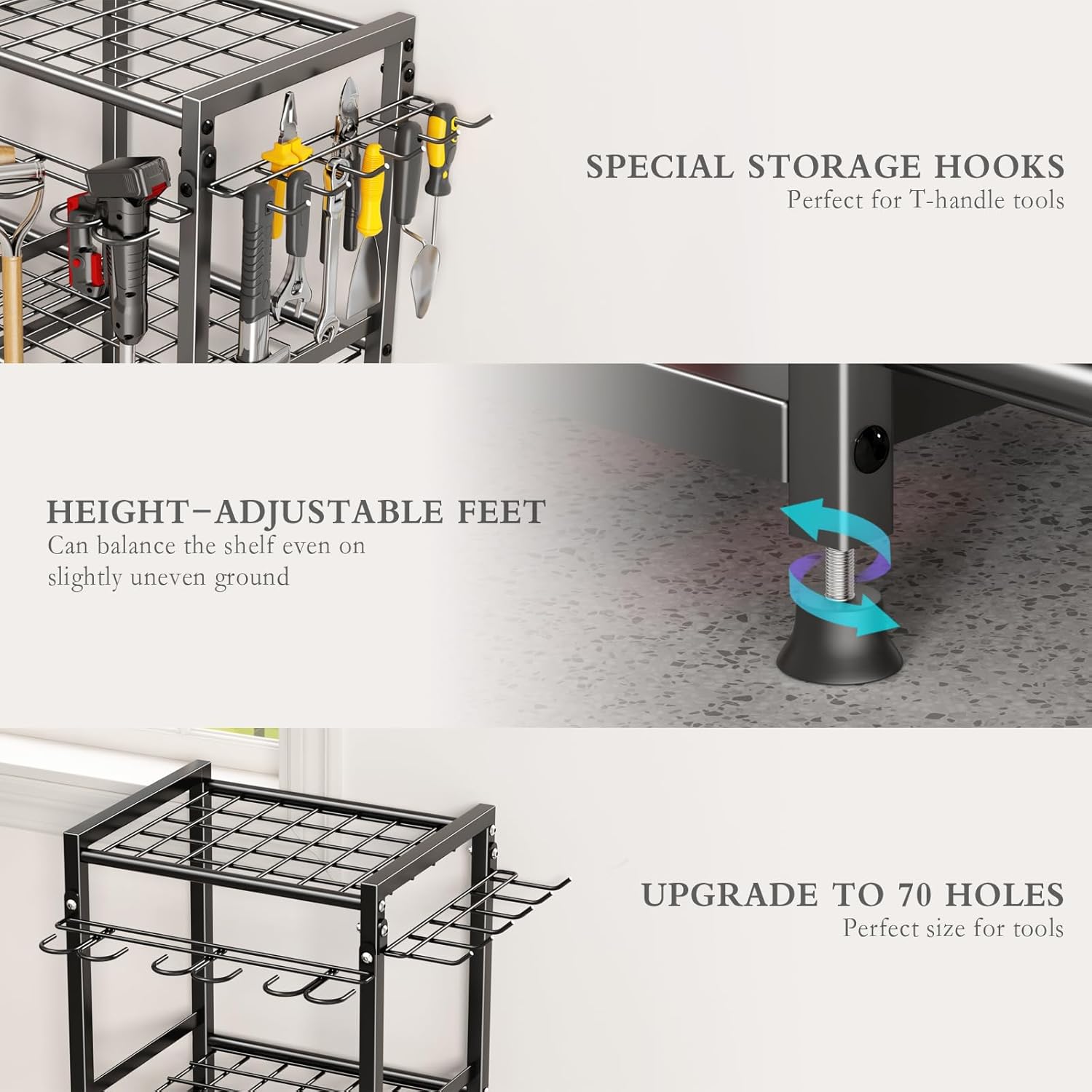 - 【Large Storage Capacity】The size of our shed organizer is 15.7" L*12.6" W*31.3" H, which can hold up to 35 long-handled tools, rakes, and brooms, and the size of the hole is 2"*2.1". It also provides multi-layer racks and adjustable hooks, allowing you to arrange the tools according to their size and shape flexibly, maximizing the use of space, giving each tool a fixed position, and storing them in a neat and orderly manner, eliminating the feeling of clutter, and creating a clean and tidy working environment for you.