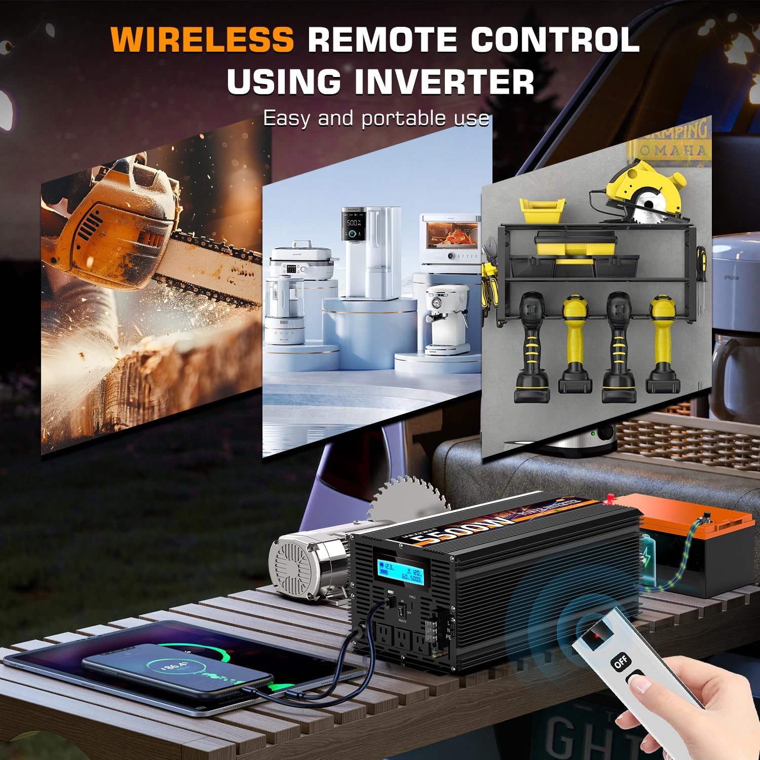 5500 Watt Power Inverter 12V DC to 110V 120V Converter for Family RV Off Grid Solar System Car with Type-C Ports 3 AC Power Outlets Dual USB Ports LCD Display Wireless Remote Control