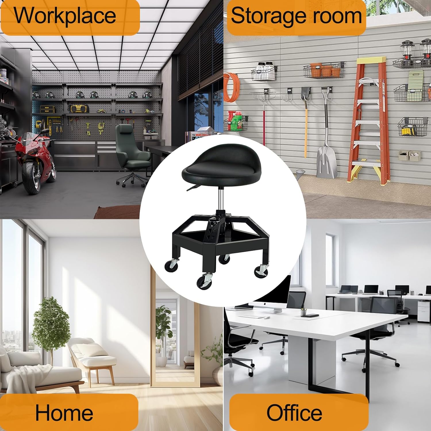 - 【Adjustable Height for Maximum Comfort】Customize your seat height to fit any task with this shop rolling stool. Whether you’re working on cars, motorcycles, or home projects, adjustability helps reduce strain and improve efficiency.
