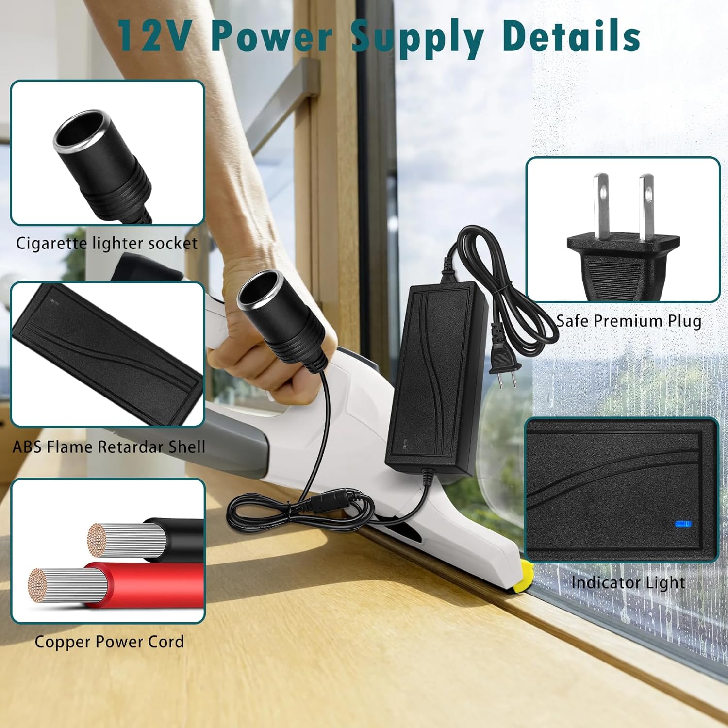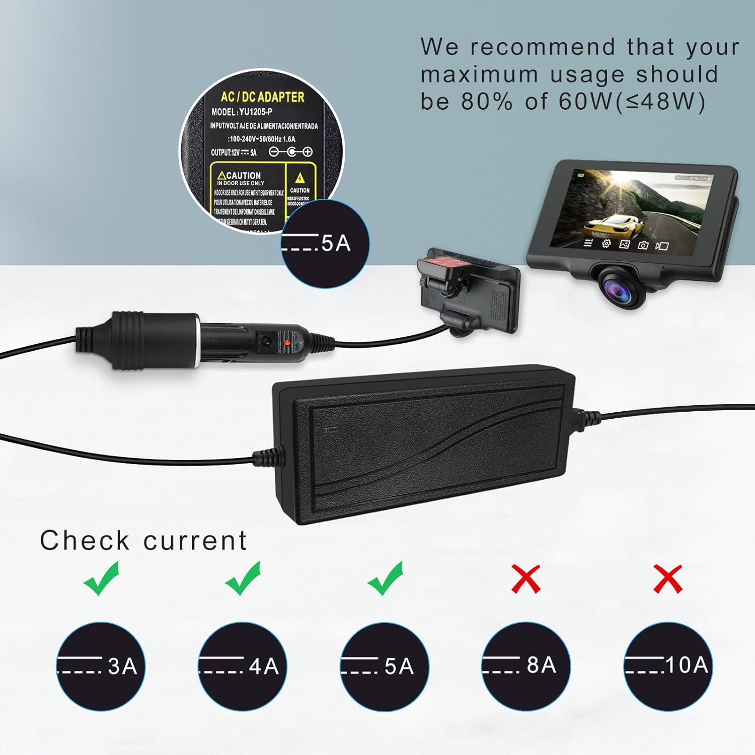 - Input: 100-240V AC; Output: 12V DC 5A 60W; Standard U.S. 2-pin plug and female car lighter connecter; Suggestion: Use no over 80% of the 12v driver's capacity; Please check if your device's is a standard car cigarette lighter plug before use