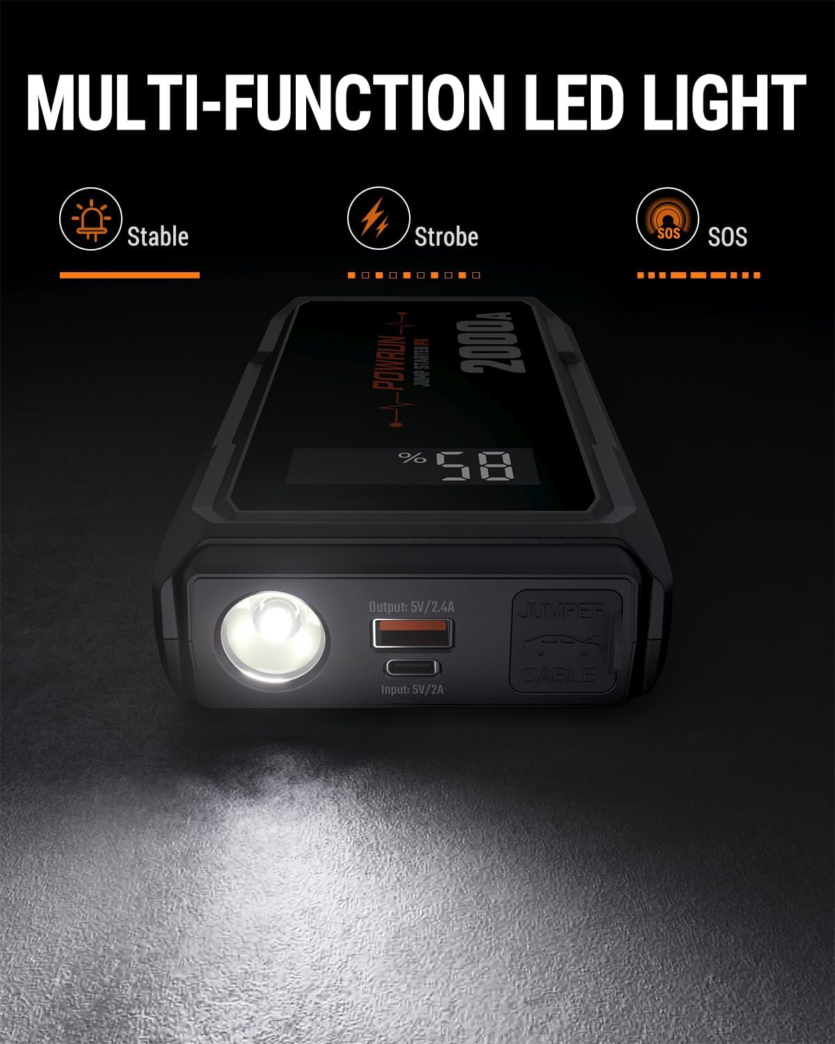Powrun P-X Jump Starter, 2000A Portable Jump Box - Car Jump Starter Battery Pack for up to 6.0L Gas and 5.0L Diesel Engines, 12V Battery Jump Starter with Carry Bag