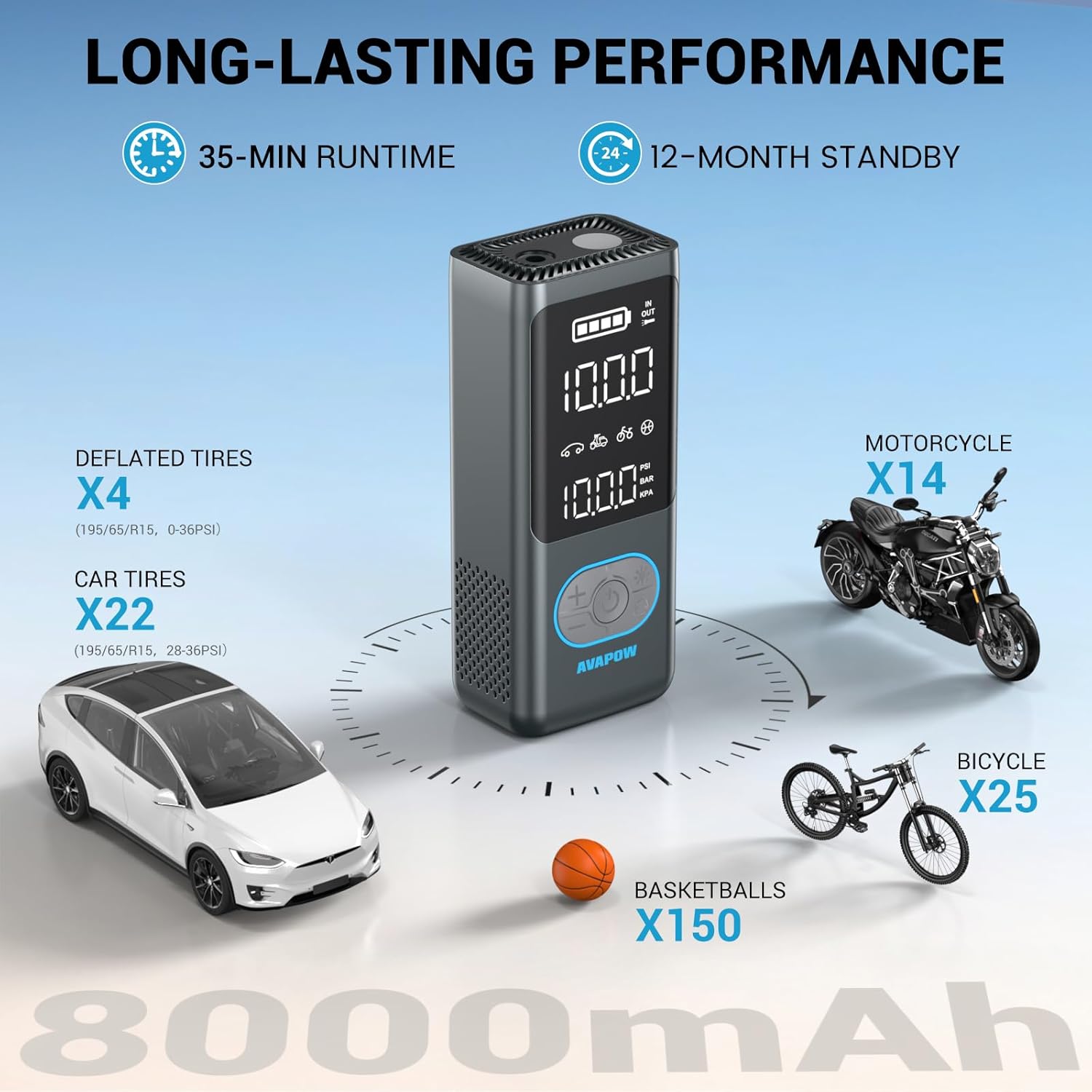 - Long-Lasting 8000mAh Battery Tire Compressor for Automatic Tire Inflator: The robust 8000mAh car tire inflator portable air compressor delivers up to 35 minutes of runtime, inflating up to 22 tires (195/65/R15, 30-36PSI), 4x deflated car tires, 14x motorcycle tires, 25x bike tires, or 150x basketballs on a single charge. Plus, with a 12-month standby time, it’s always ready to go when you need it!