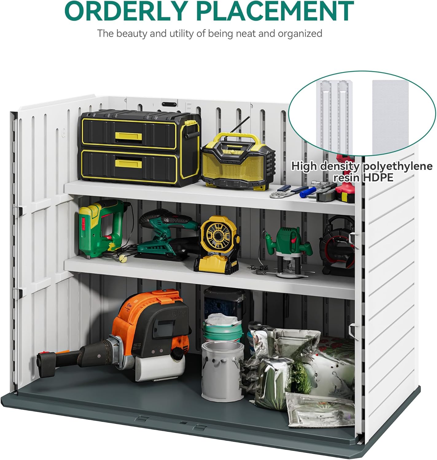 - Robust Build: Using tough HDPE material, the space-saving shelf for outdoor storage sheds ensures sturdy support for your belongings, promising longevity and protection for your shed contents