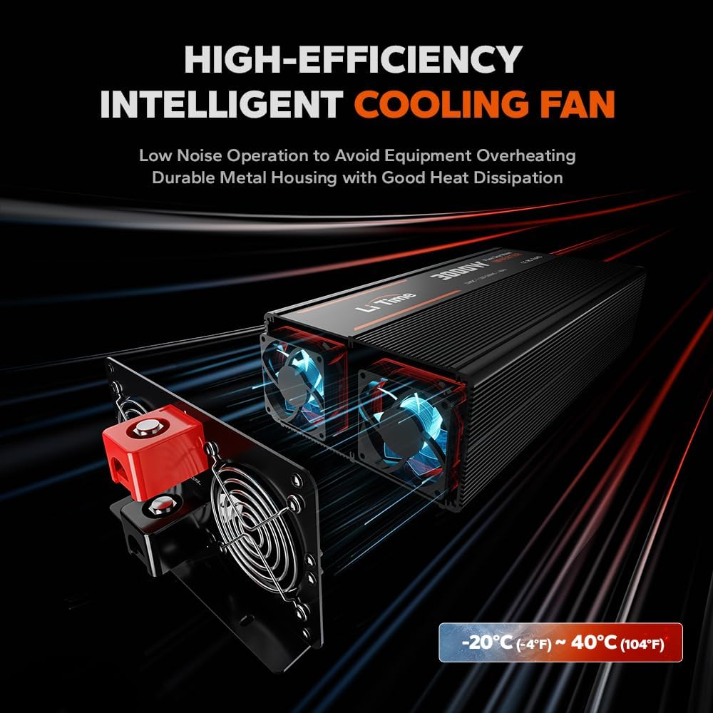 - All-round Safety Protections: The LiTime Inverter ensures all-around safety with over-voltage, low-voltage, overheat, overload, and short-circuit protections, safeguarding both your devices and the system. Its high-efficiency dual cooling fans intelligently regulate temperature, enabling smooth performance even in extreme environments (-20℃ to 40℃).