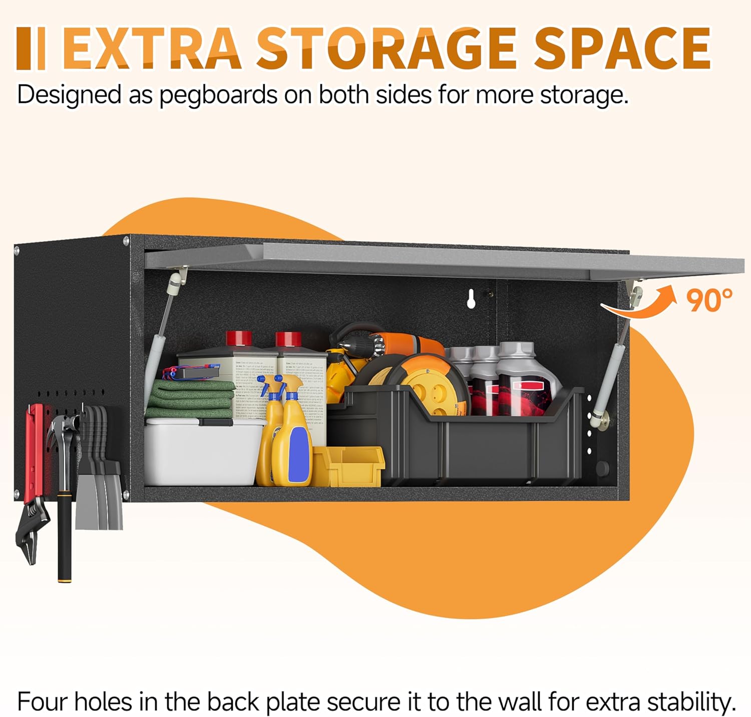 - 【Safely On The Wall】Firstsky Garage Wall Cabinet is made of high quality materials, carefully designed and rigorously tested to ensure a solid structure, capable of storing heavy objects without warping. There are four holes on the back panel to secure it to the wall for extra stability. Up to 120 pounds weight capacity allows you to store any item you want. Compared to other cabinets, you can hang more tools on the sides while it remains stable.