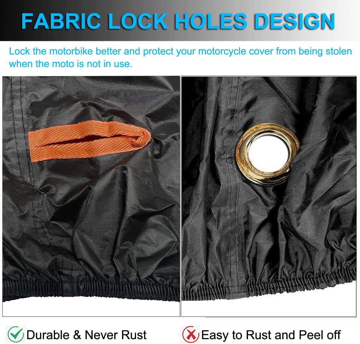 - 【Anti-theft Lock Holes】 Designed with 2 lock holes (front and rear)is helpful to lock the motorbike better and protect your scooter cover from being stolen. Compared with the metal lock hole, ours is never rust and peeling, perfect for motorcycle outdoor storage.