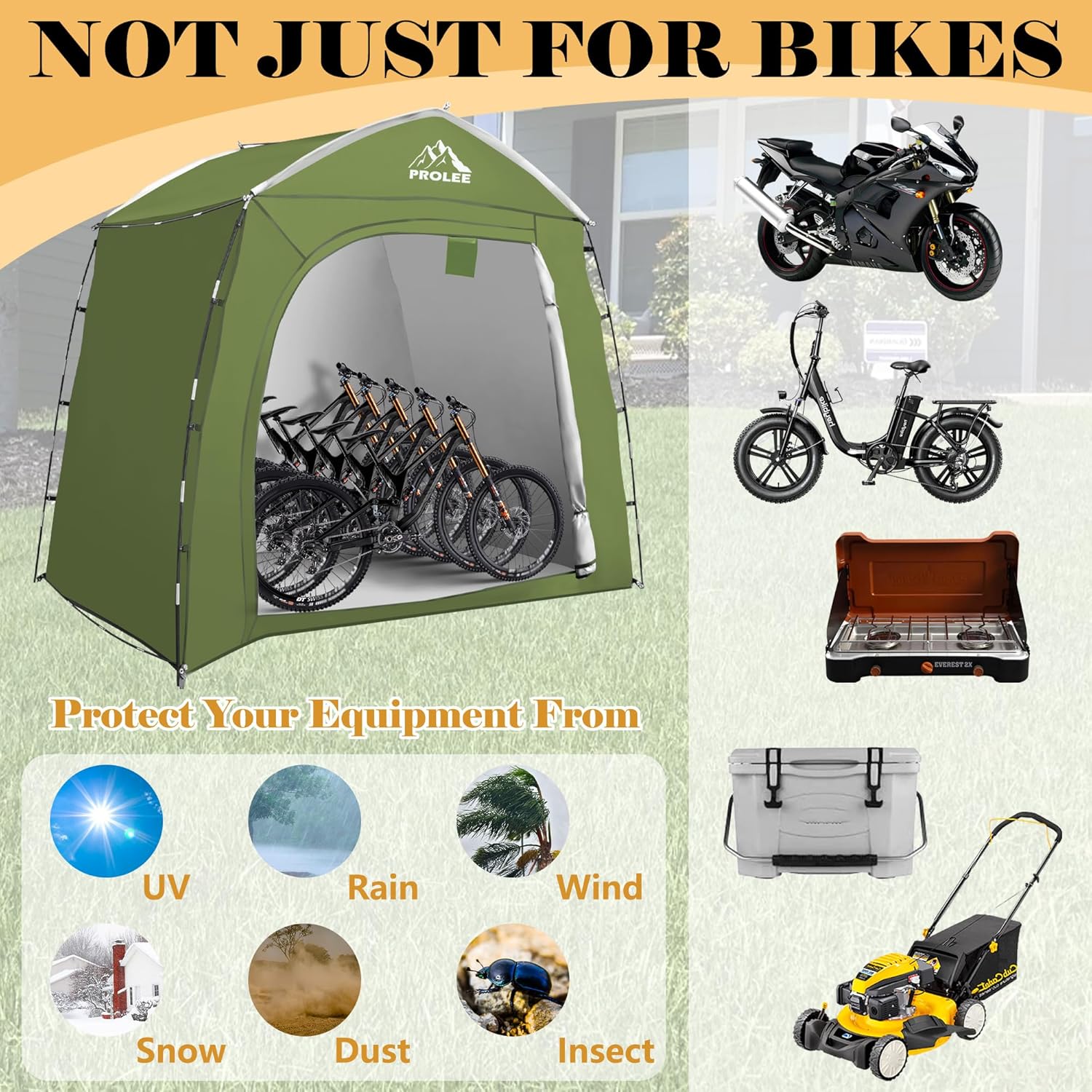 - 【Versatile Storage for All Your Needs】Beyond bike or motorcycle storage, this versatile tent is perfect for organizing and protecting your camping stuff, garden tools, pool equipment, and other outdoor essentials. Say goodbye to clutter in your shed or garage – with this all-in-one storage solution, everything stays neat, tidy, and accessible.