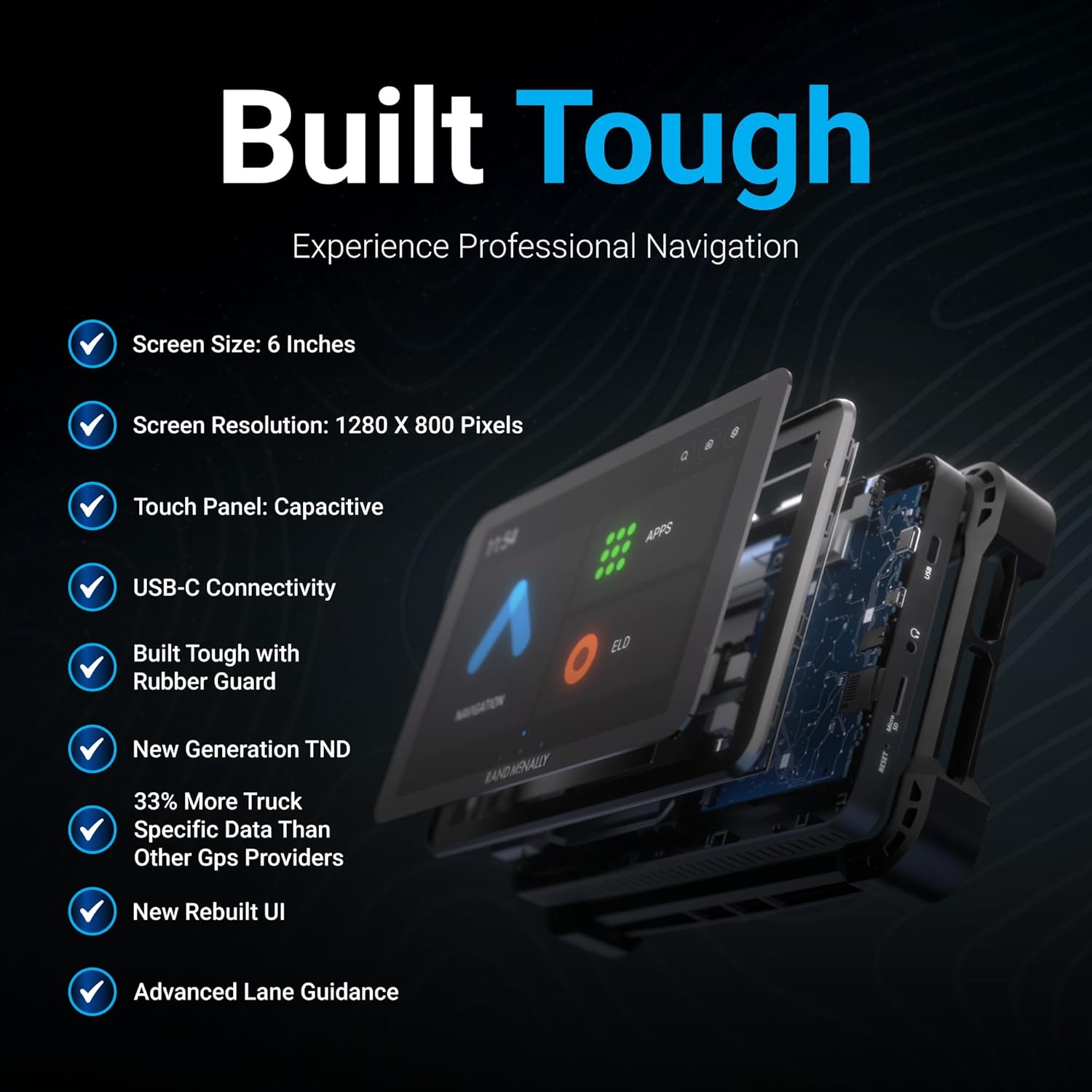 - Included Components : Contained Lithium Ion Battey, Heavy-duty Suction Mount, Rand Road IQ for Custom Truck-safe Routes, RandTab 6 GPS Tablet + Screen Protector, Truck Charger & USB-C Cable Contained Lithium Ion Battey, Heavy-duty Suction Mount, Rand Road IQ for Custom Truck-safe Routes, RandTab 6 GPS Tablet + Screen Protector, Truck Charger & USB-C Cable