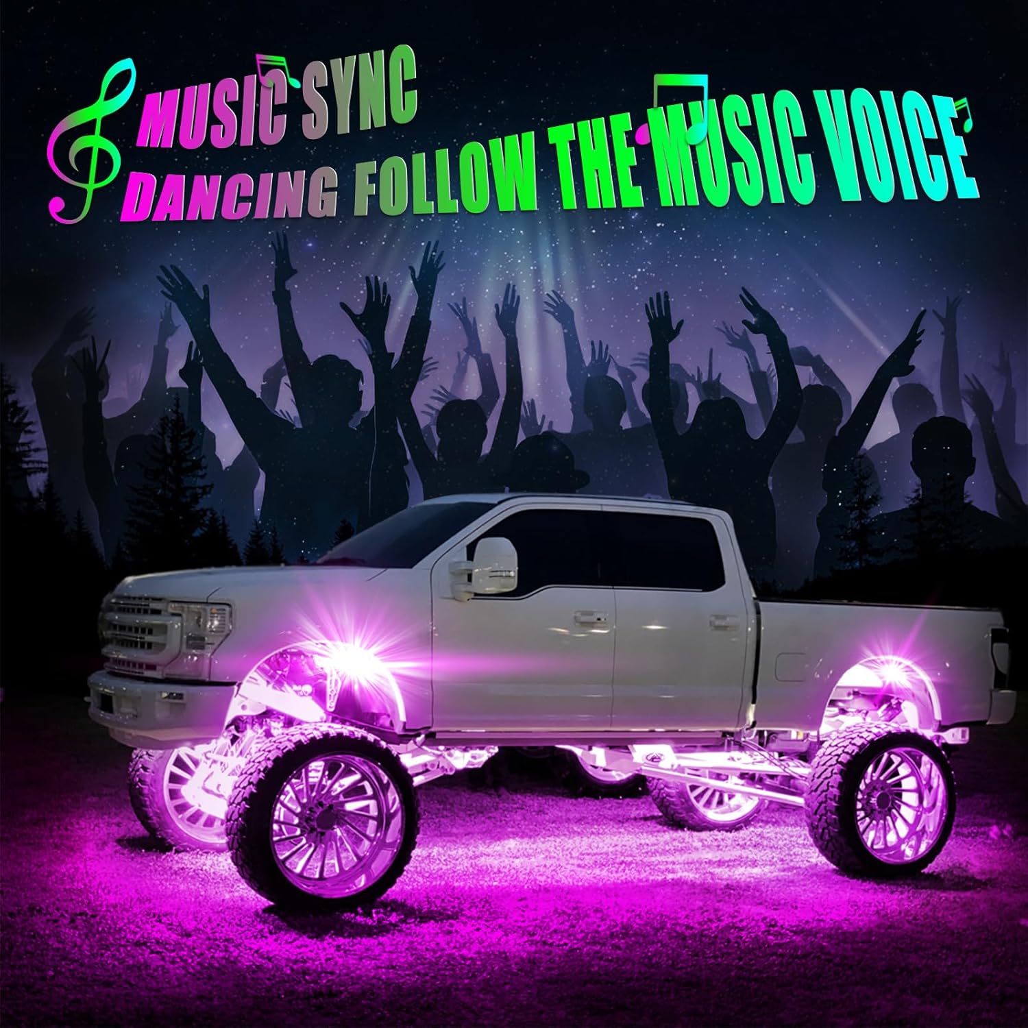 - 𝟐 𝐑𝐞𝐦𝐨𝐭𝐞 𝐂𝐨𝐧𝐭𝐫𝐨𝐥 𝐎𝐩𝐭𝐢𝐨𝐧𝐬: APP and 4-button remote, allowing for more flexible operation.Wheel well lights offers millions of different colors with brightness adjustment, 23 modes of flashing & strobing with speed adjustment, sync with music rhythm, voice responsive, and timing function for your choice,There are also custom colors and modes available