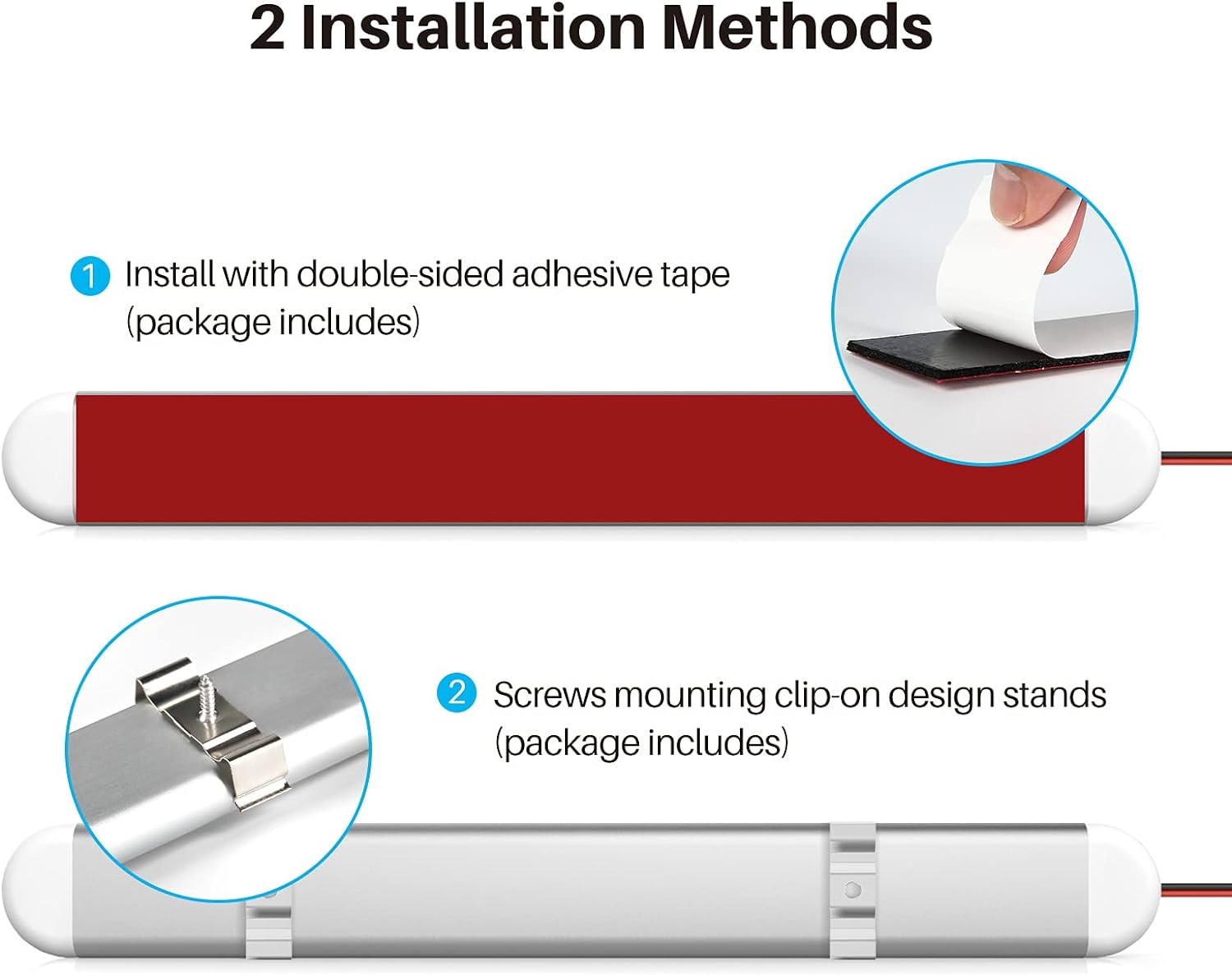 - 【Easy to Install】 - Plug the 12v led lights into your car with red line connecting to“+” pole, black line connecting to“-” pole, then it’s ready to go. Simply tear off the strong double-sided adhesive and stick them on proper place, and clips that come with the package ensure the light bar securely fastened and wires can be tidily hidden. There are also optional screws for various needs accordingly and adoption of resistant material makes the light withstand any extreme weather.