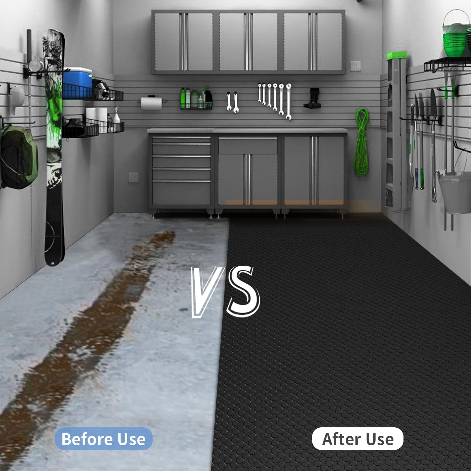 - HEAVY DUTY PROTECTOR MATS: Protect your garage floor from difficult to remove grease or rust stains, oil spills from your car, truck or motorcycle, tire skids, chemical drips, or other substances that may damage your floors.