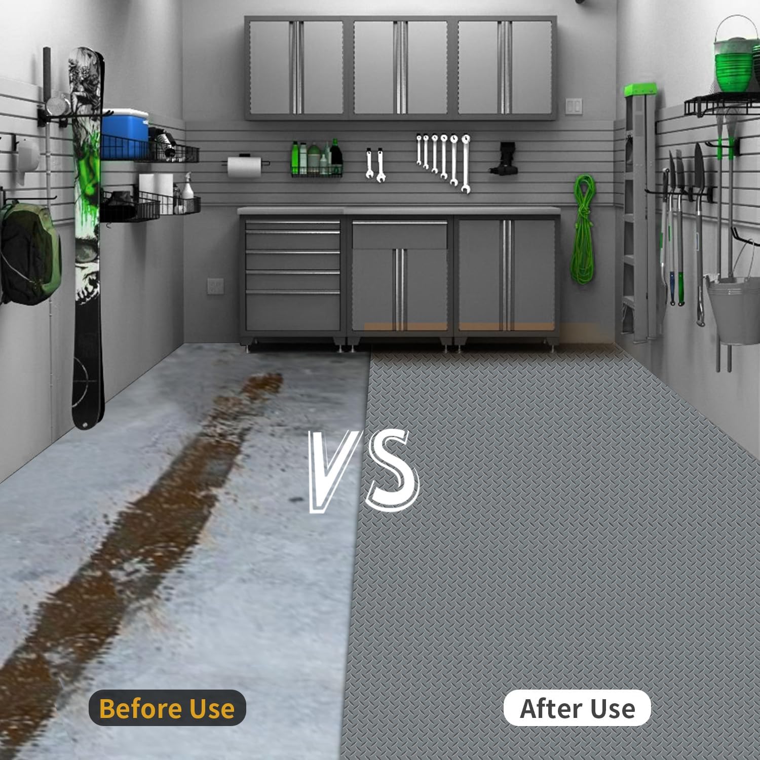 - HEAVY DUTY PROTECTOR MATS: Protect your garage floor from difficult to remove grease or rust stains, oil spills from your car, truck or motorcycle, tire skids, chemical drips, or other substances that may damage your floors.