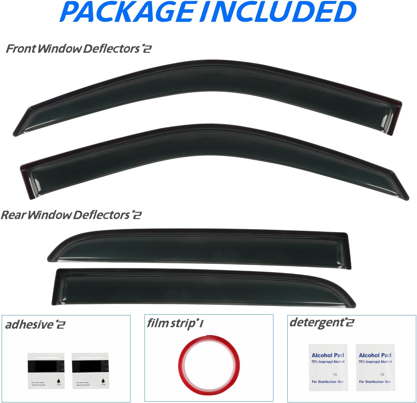 - 【Package Included】 4 pcs Vent Guards Shade Window Visors set - 2 pcs rear & 2 pcs front Vent Guards Visors, 2 pcs alcohol pad, 2 pcs adhesion promoter, a manual, a rool of spare double-sided tape