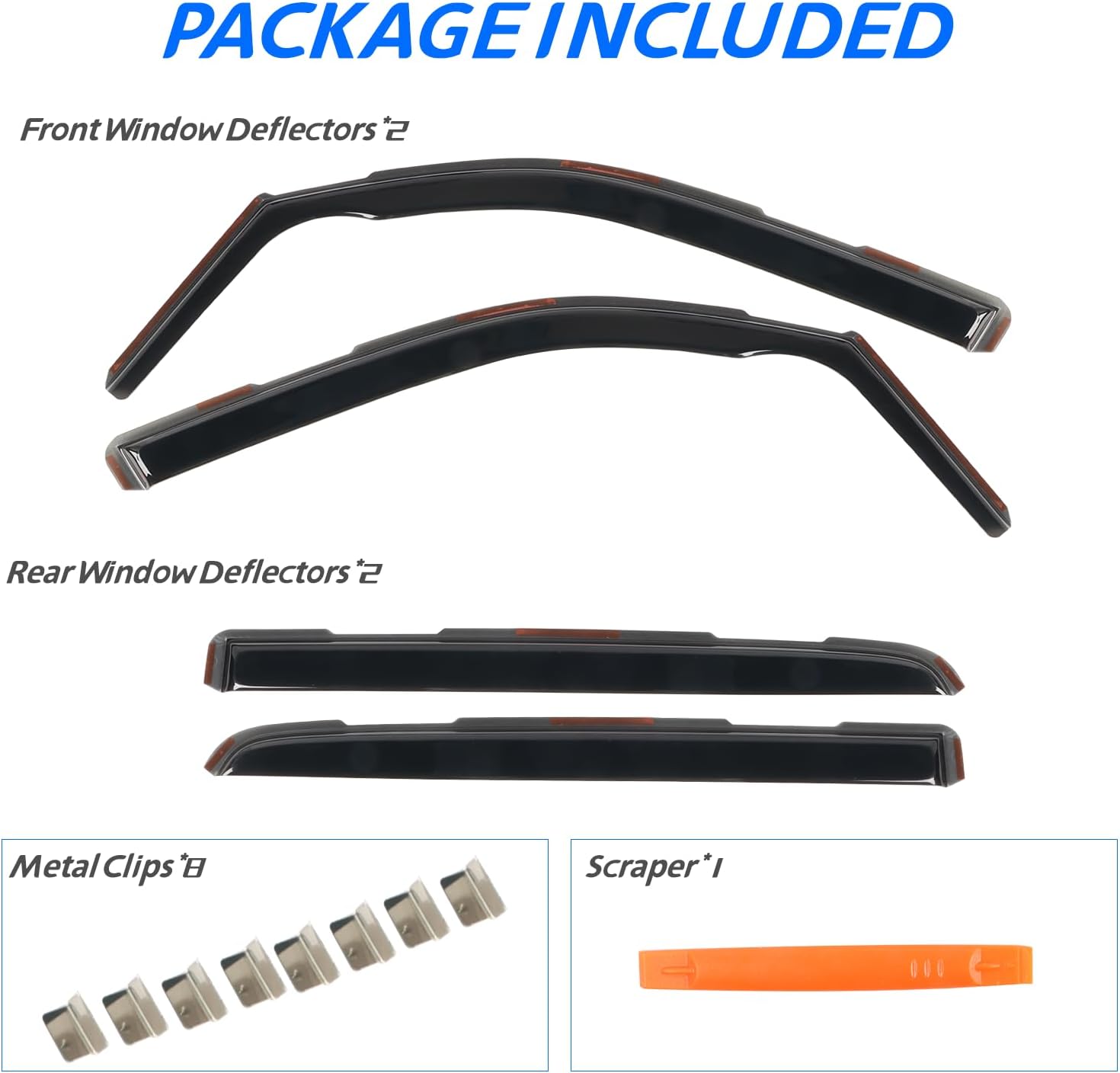 - 【Easy Installation】 Come with 4 pcs FULL-SIZE side window deflectors, 8 pcs clips, 1 pcs plastic Crowbar for a durable and secure installation. No complicated instructions are needed. Attention: Please apply the clip to fix the rain guards