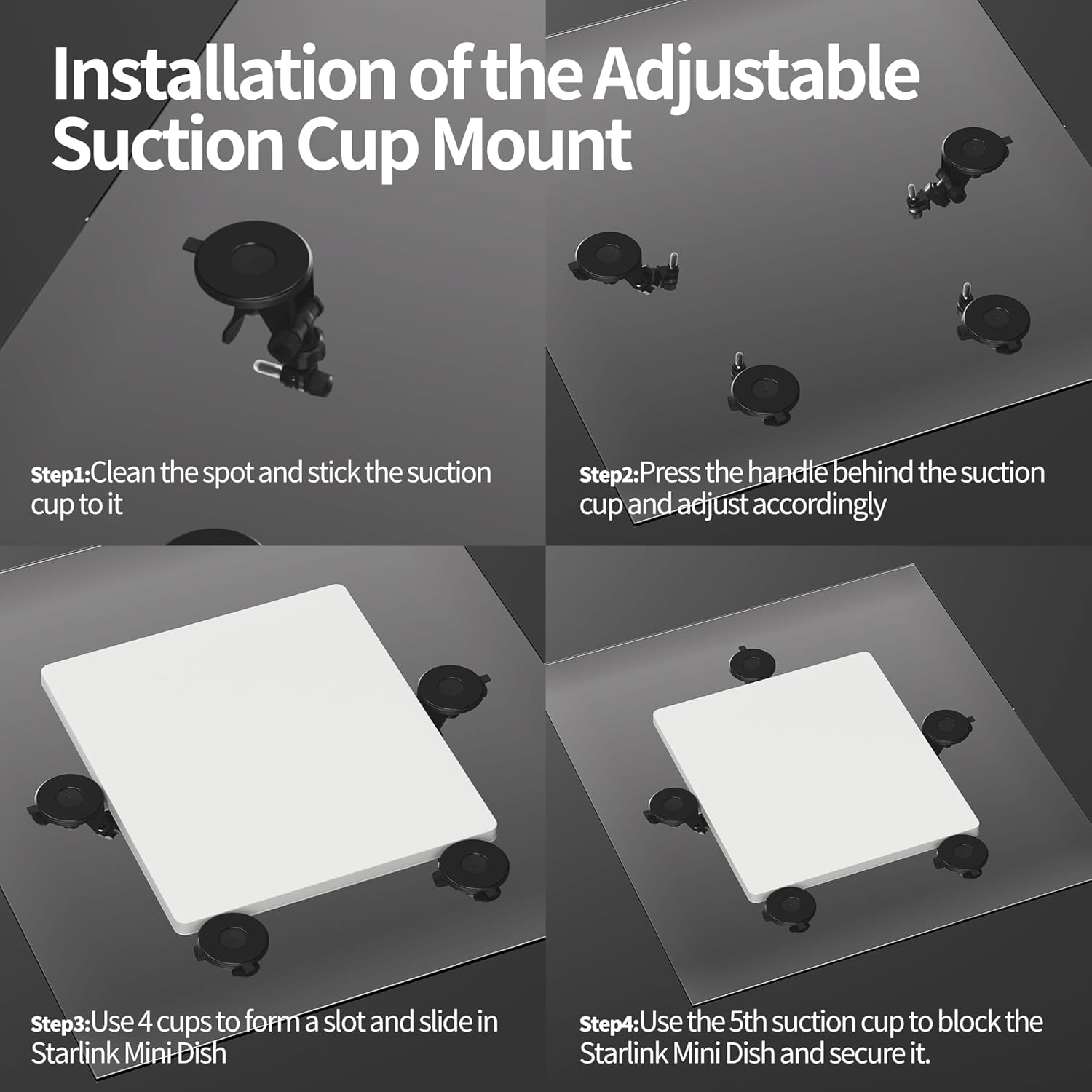 - Various Installation Scenarios: This Starlink Mounting Kit got 5 suction cups so that you can DIY your mounting whether on sunroof, rear windshield or front windshield, even on the car roof.