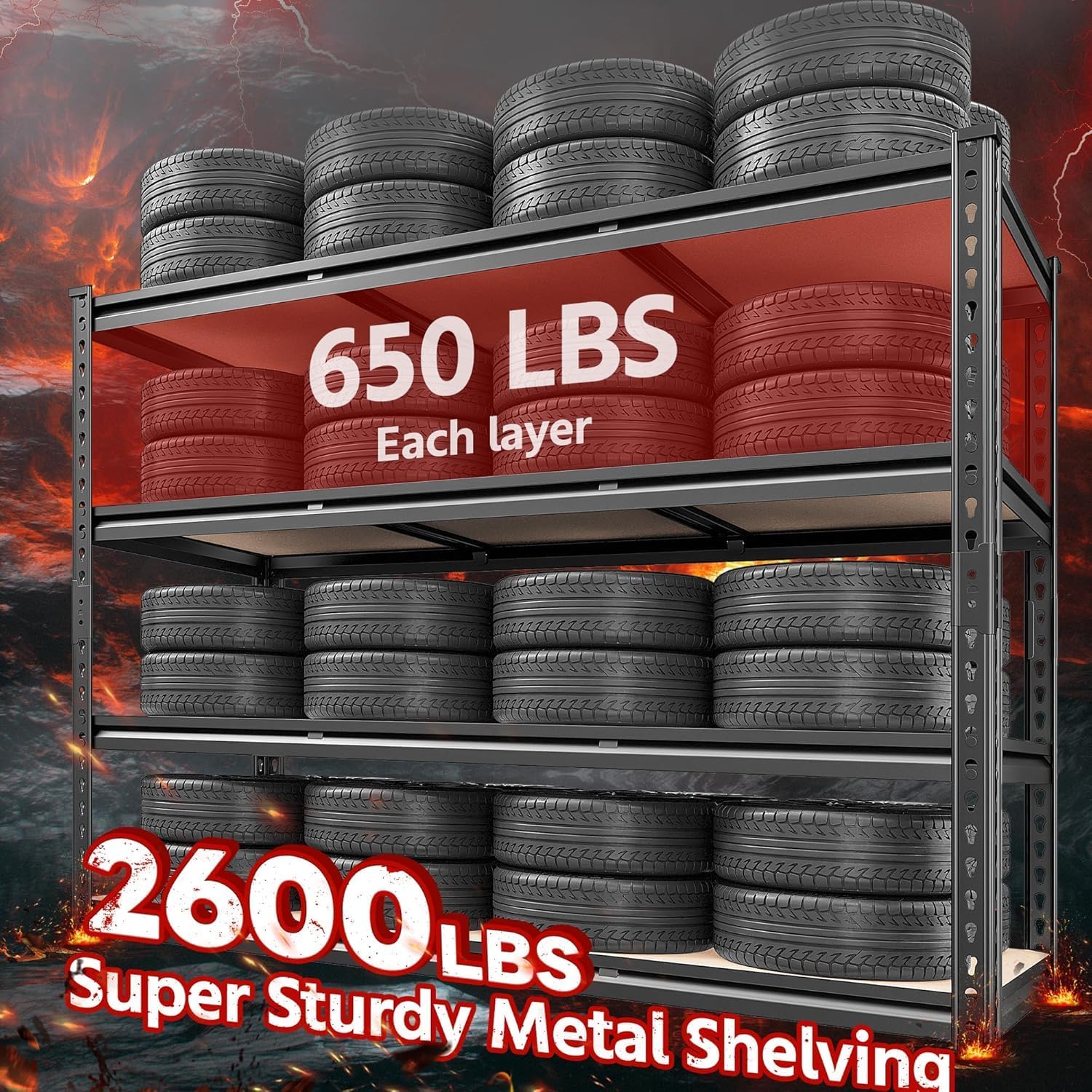 - 【2600LBS Capacity Garage Storage Shelves Heavy Duty】REIBII heavy duty garage shelving is constructed with reinforced steel legs and rolled-edge columns, featuring a high-quality metal frame combined with durable 7mm thickened MDF board. Each metal shelf, supported by beams underneath, has a weight capacity of up to 650 lbs, contributing to an overall bearing capacity of 2600 lbs. This design enhances the sturdiness of the garage shelves and enables efficient storage of numerous items.
