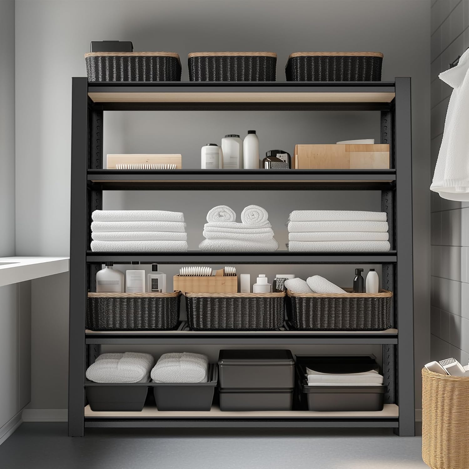 - 【3000LBS Heavy-Duty Strength】Each shelf holds up to 600lbs, with a total capacity of 3000lbs. Built with rolled-edge uprights for extra stability, this garage shelving heavy duty unit securely stores heavy items in garages, offices, or homes.