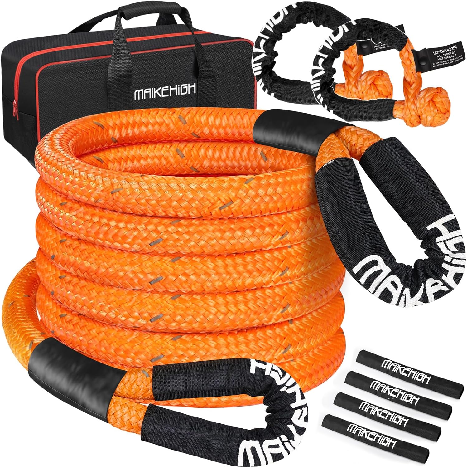 - [Enhanced Elasticity] - MAIKEHIGH recovery ropes stretch up to 30-35%, this helps to make the pulling of vehicle smoother. The elastic potential energy of the rope overcomes the resistance of the stuck vehicle and converts the stored energy into kinetic energy, thus steadily pulling the trapped vehicle without transmitting a large impact.