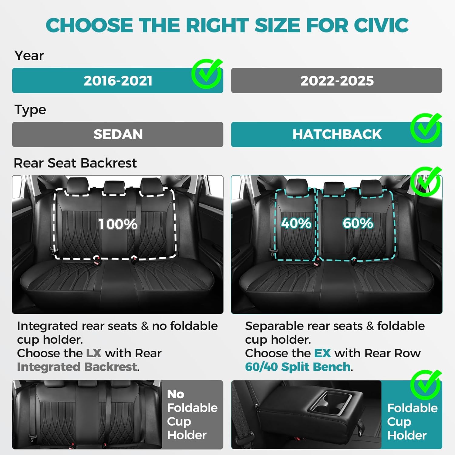 - Tailored for Civic - Designed exclusively for civic, ensuring a perfect fit like a glove.Say goodbye to ill-fitting, sliding universal covers with limited coverage.Please note that these size only fit for the 2016-2021 Civic hatchback EX,sport touring,EXL.Ensure that your back row has three seats that are split 40/60 and equipped with foldable cup holder armrests, and that your Civic is a hatchback model.