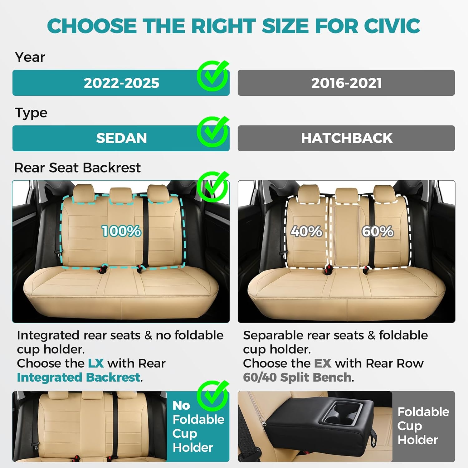- Tailored for Civic - Designed exclusively for civic, ensuring a perfect fit like a glove.Say goodbye to ill-fitting, sliding universal covers with limited coverage.Please note that these size only fit for the 2022-2025 Civic LX. Ensure that the three seats in the back row are integrated and do not have a foldable cup holder armrest.