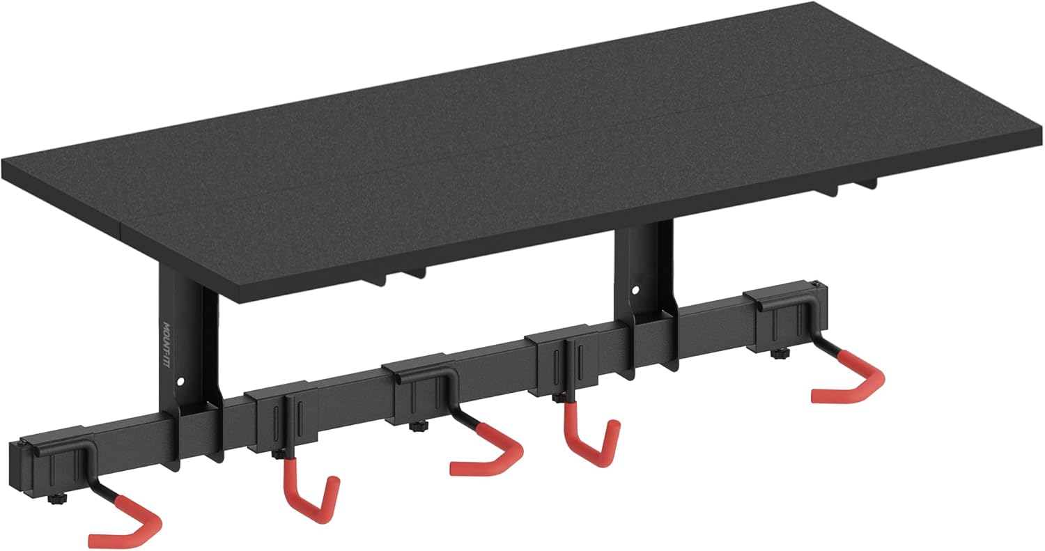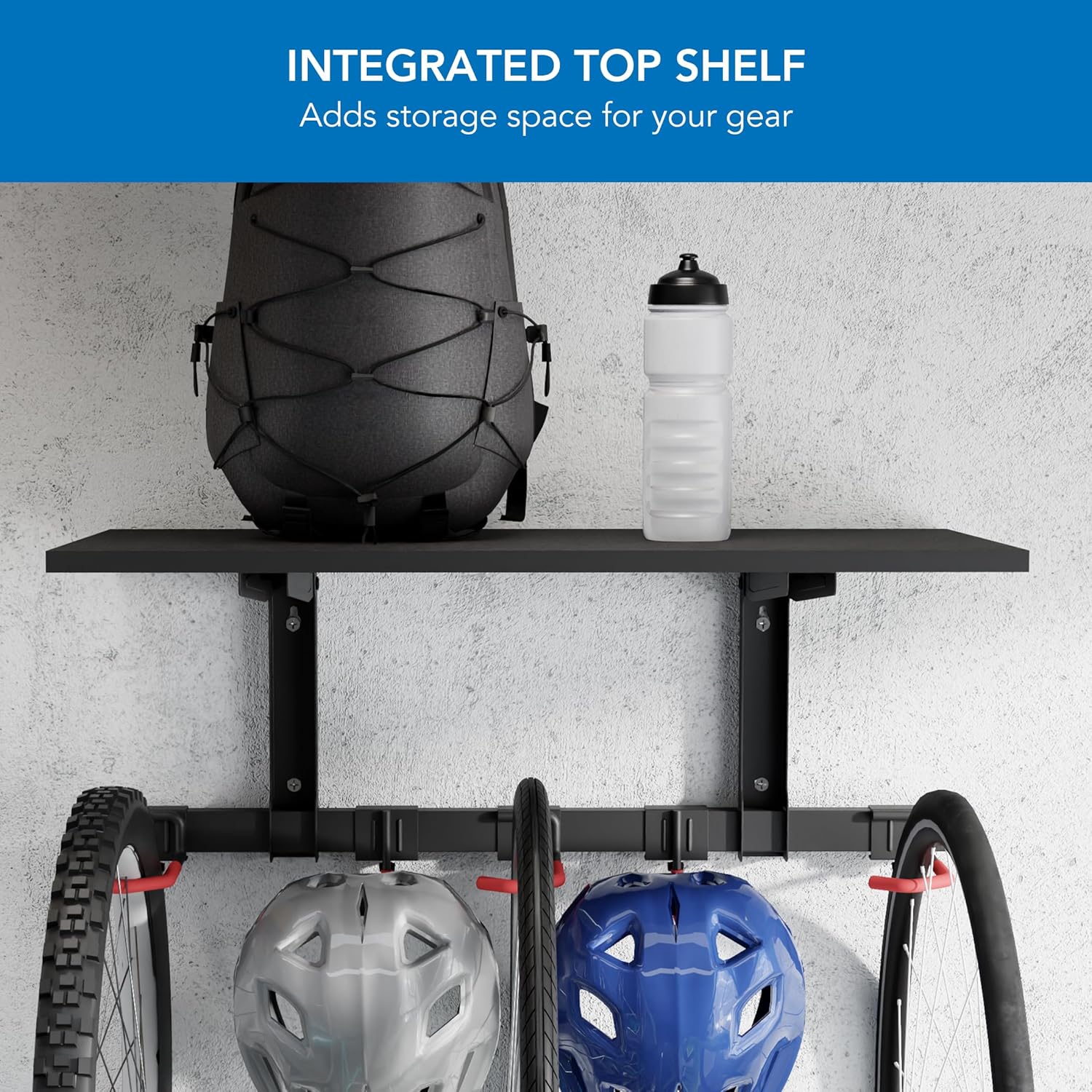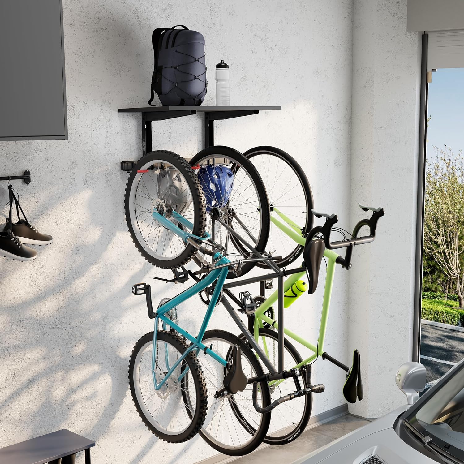 - SPACE-SAVING BIKE STORAGE RACK – Maximize your garage or shed space with our wall-mounted bike storage rack. Holds up to 3 bikes and additional gear on a durable top shelf, keeping your floor clear and organized.