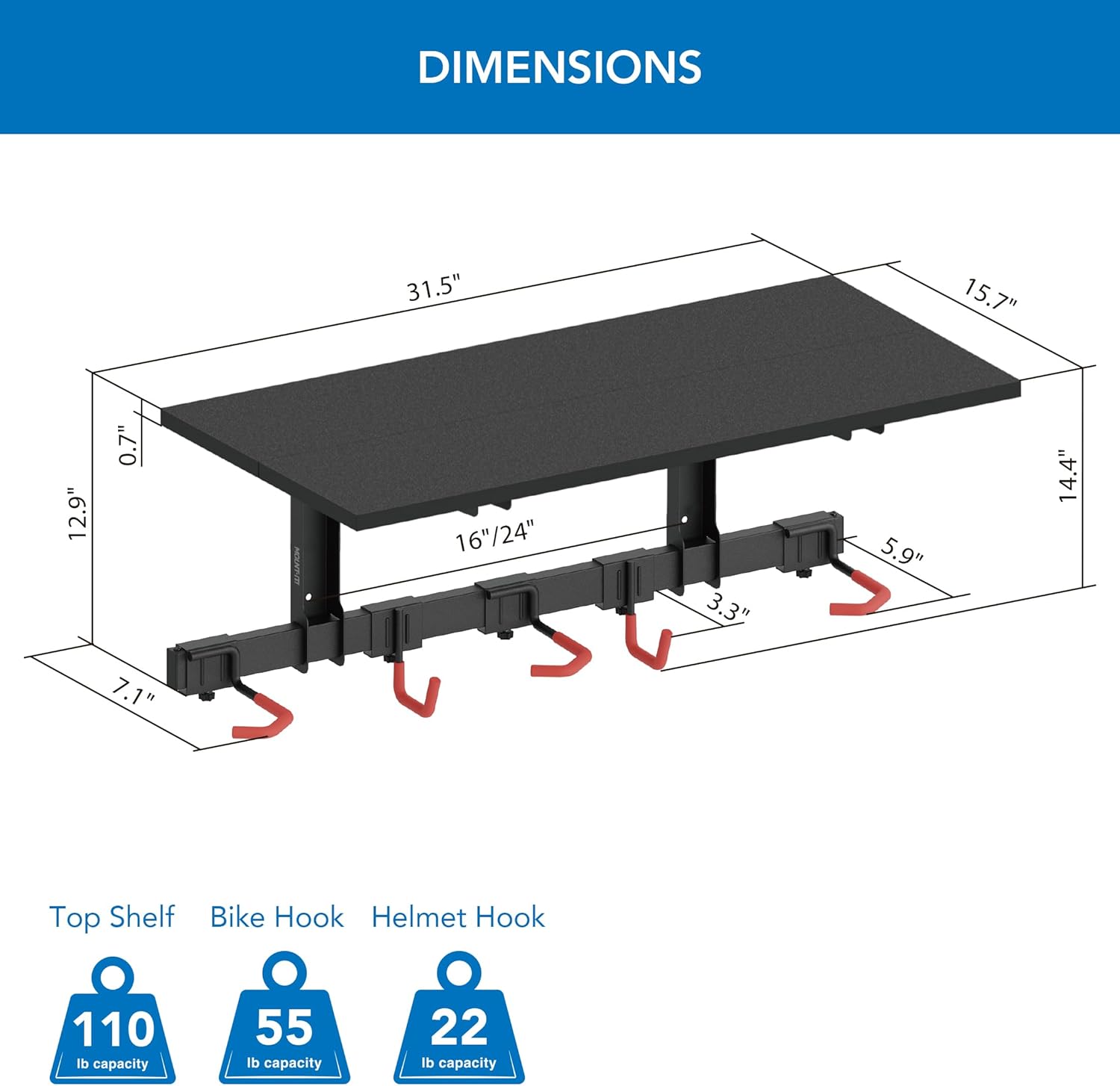 - HEAVY-DUTY GARAGE BIKE STORAGE – Built with high-quality steel and a 110 lb capacity shelf, each bike hook supports up to 55 lbs, making it ideal for securely holding all types of bikes and equipment in your garage.