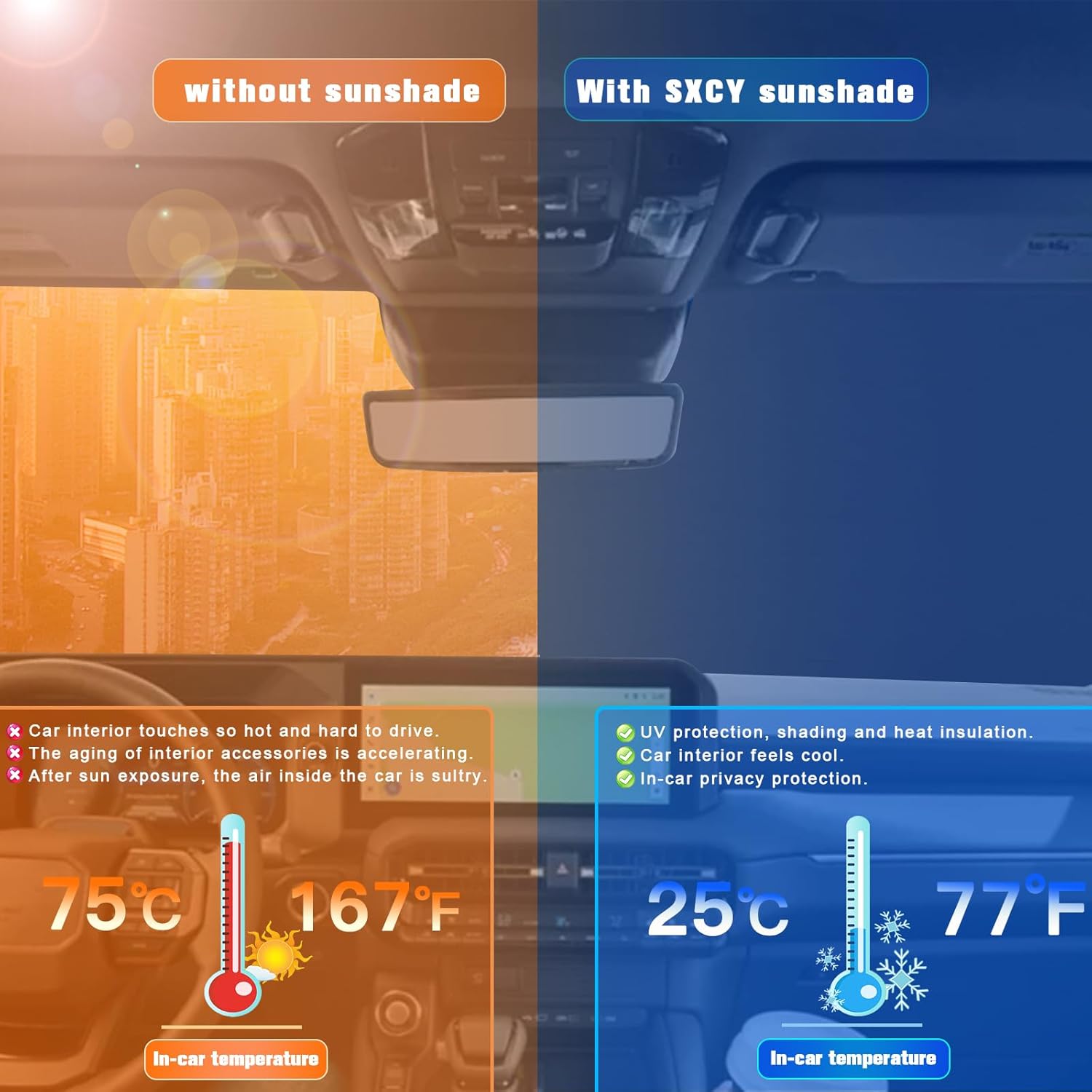 - 2.Sun Protection: Solve your concerns about parking for a long time under the scorching sun,prevent the car's interior from getting sunburned and extend your car interior accessories’life.