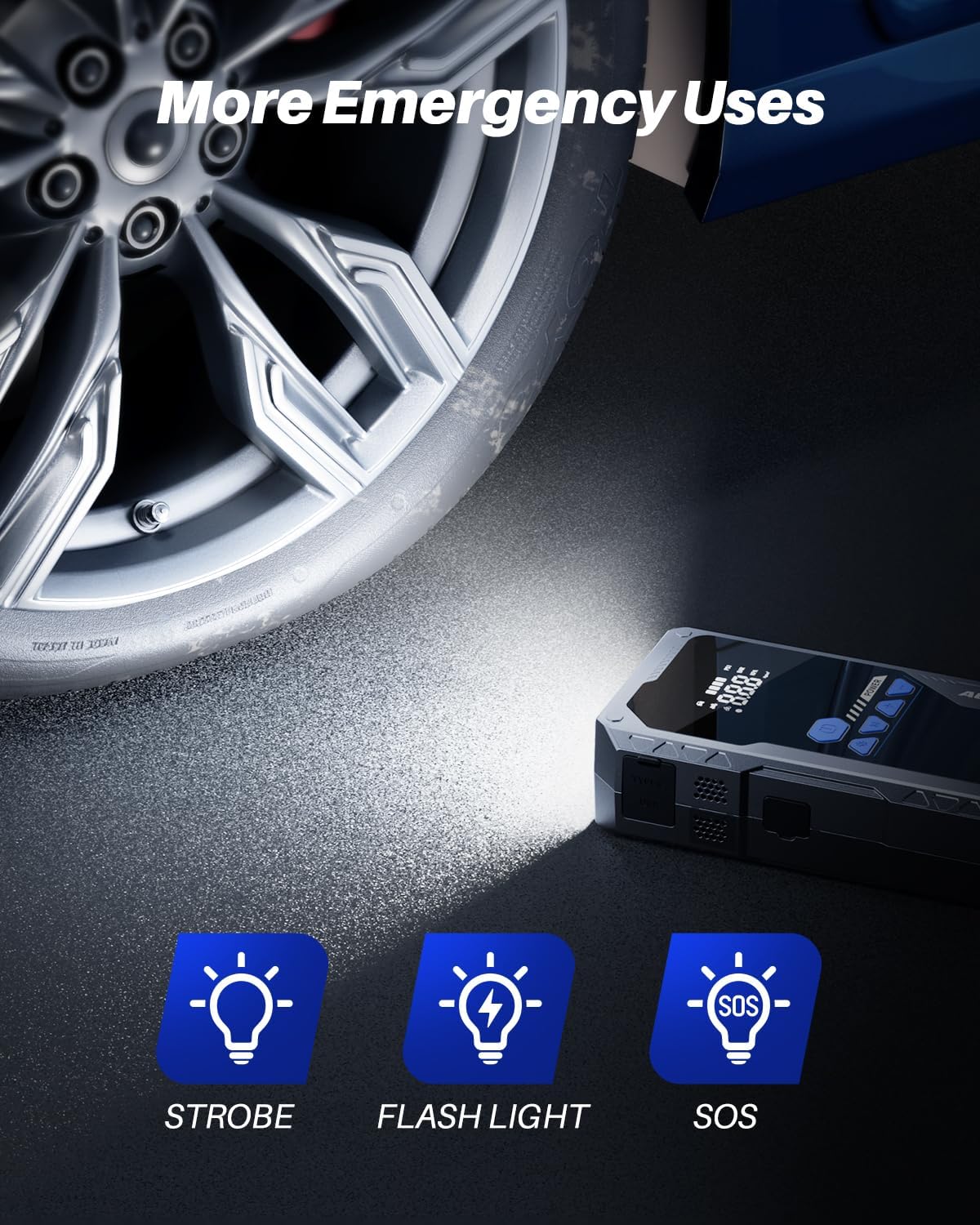 - ➤【All-in-One Utility Tool】This multifunctional device combines a powerful car jumper starter portable, a high-efficiency air compressor, a bright 400-lumen LED flashlight, and a high-capacity power bank. With USB and Type-C ports for versatile charging options, it’s your ultimate companion for emergencies, road trips, and everyday adventures. This jumper box for car battery portable is designed to meet all your needs.