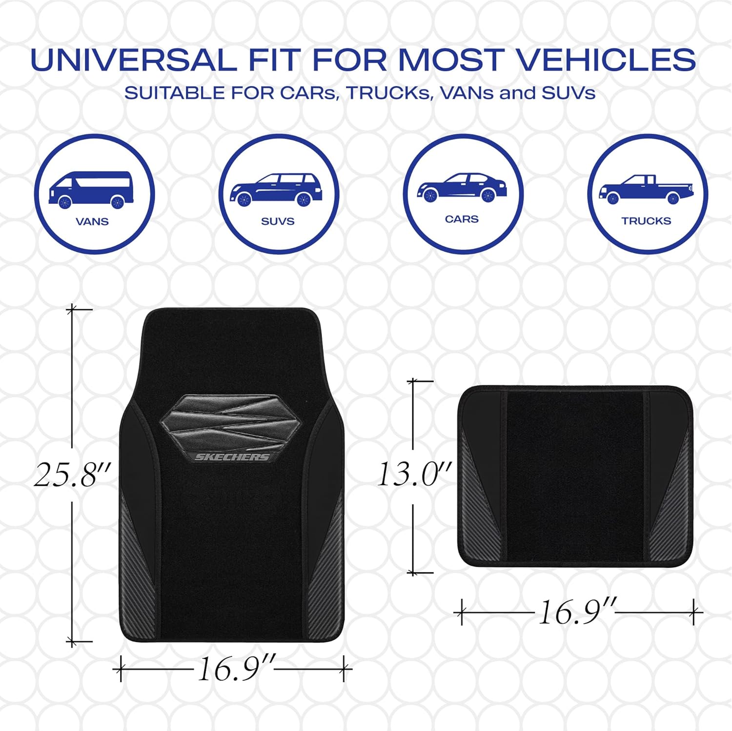 - UNIVERSAL FIT-Skechers car mats Designed to fit most SUVs,vans,sedans,and trucks, This full set includes 4 floor mats,Front piece: 25.8Ă—16.9 inches,Back piece: 11.4Ă—16.1 inches, providing comprehensive coverage for both front and rear seats, giving your entire vehicle floor the protection it needs.Perfect gift for family, relatives and friends