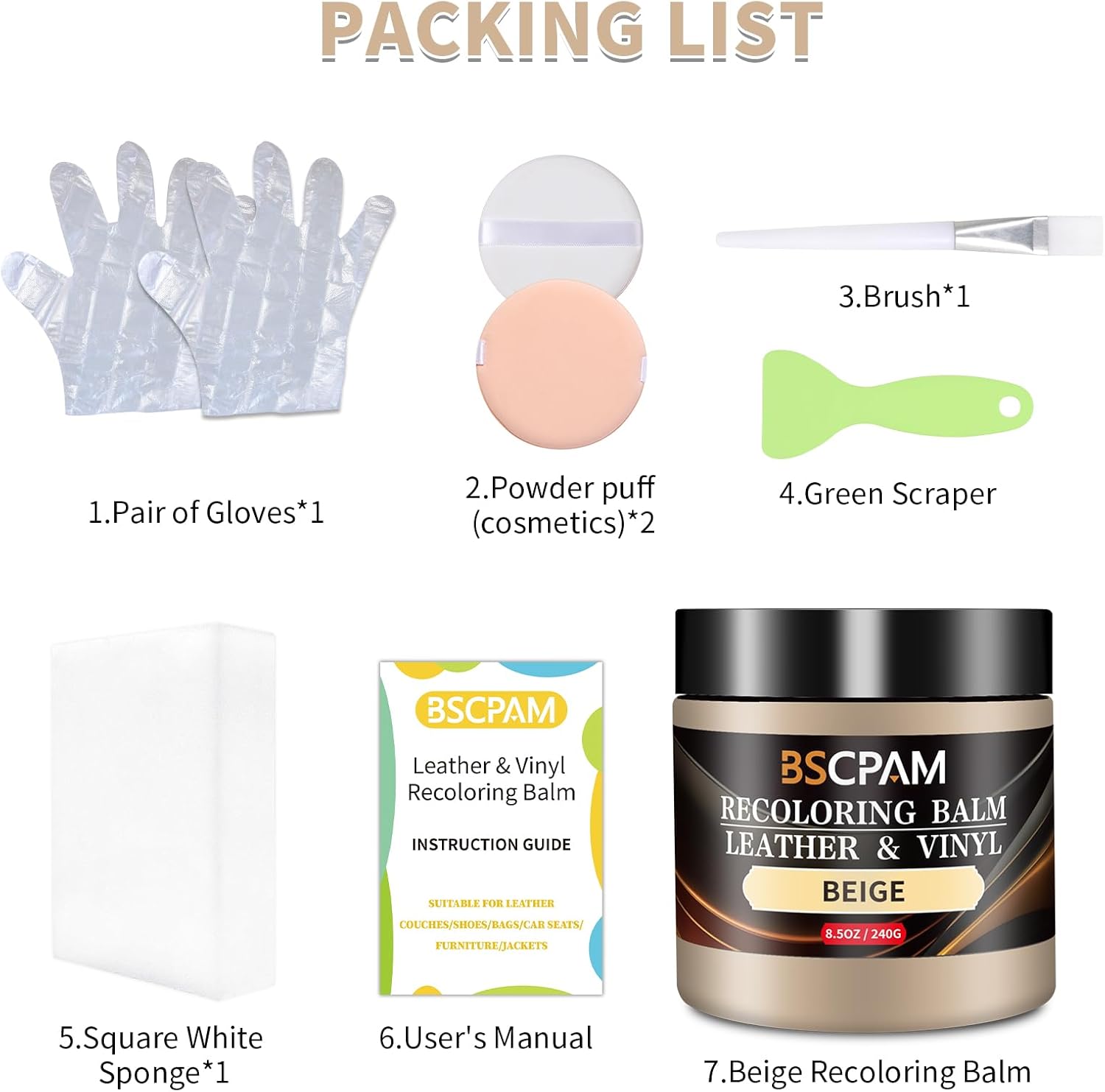 - Easy DIY Repairs: Leather repair kit includes, 1 Recoloring Balm + 1 Sponges + 2 Gloves + 2 Powder Puff + 1 Brush + 1 Putty Knife + User's Manual,meet any leather repair project