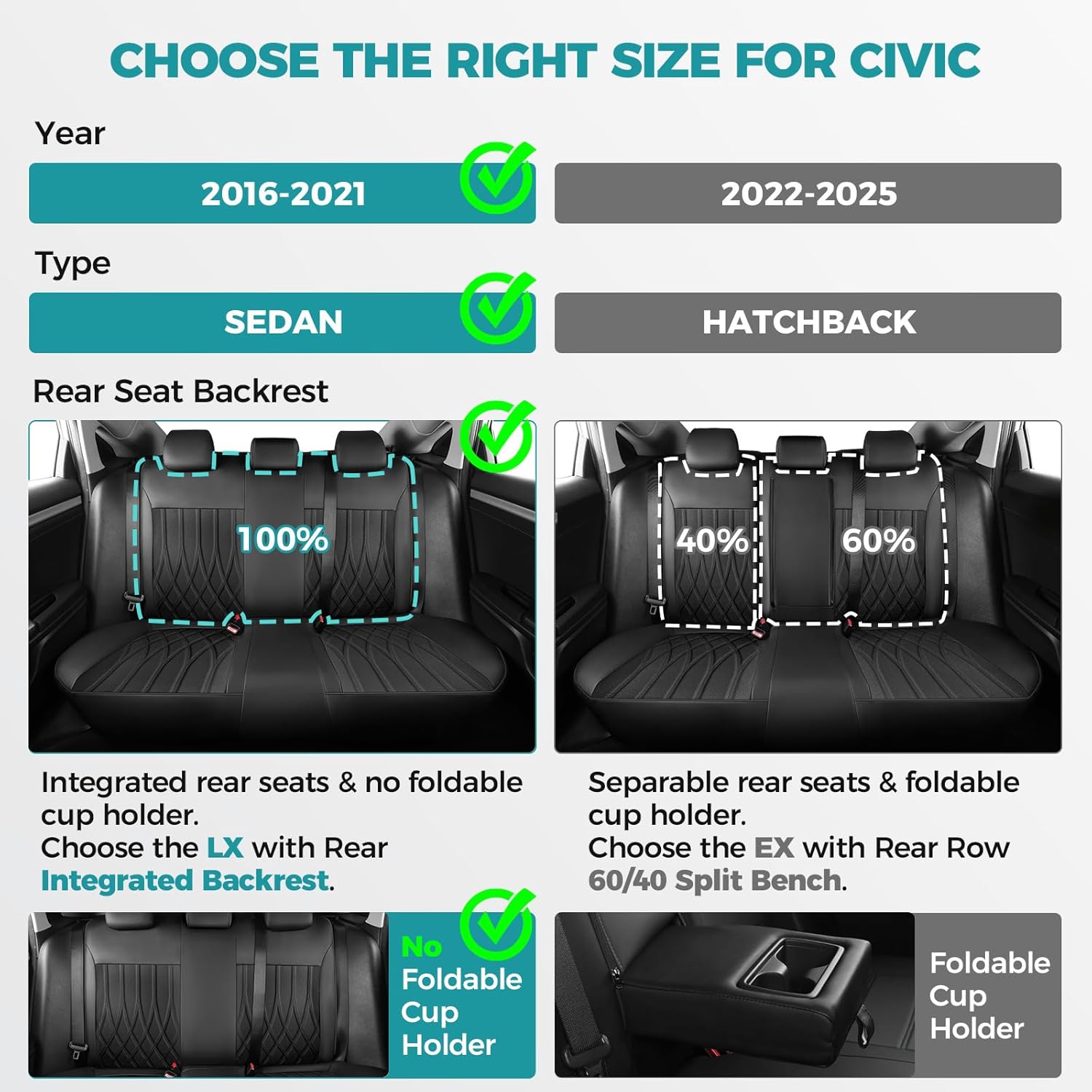 - Tailored for Civic - Designed exclusively for civic, ensuring a perfect fit like a glove.Say goodbye to ill-fitting, sliding universal covers with limited coverage.Please note that these size only fit for the 2016-2021 Civic LX. Ensure that the three seats in the back row are integrated and do not have a foldable cup holder armrest.