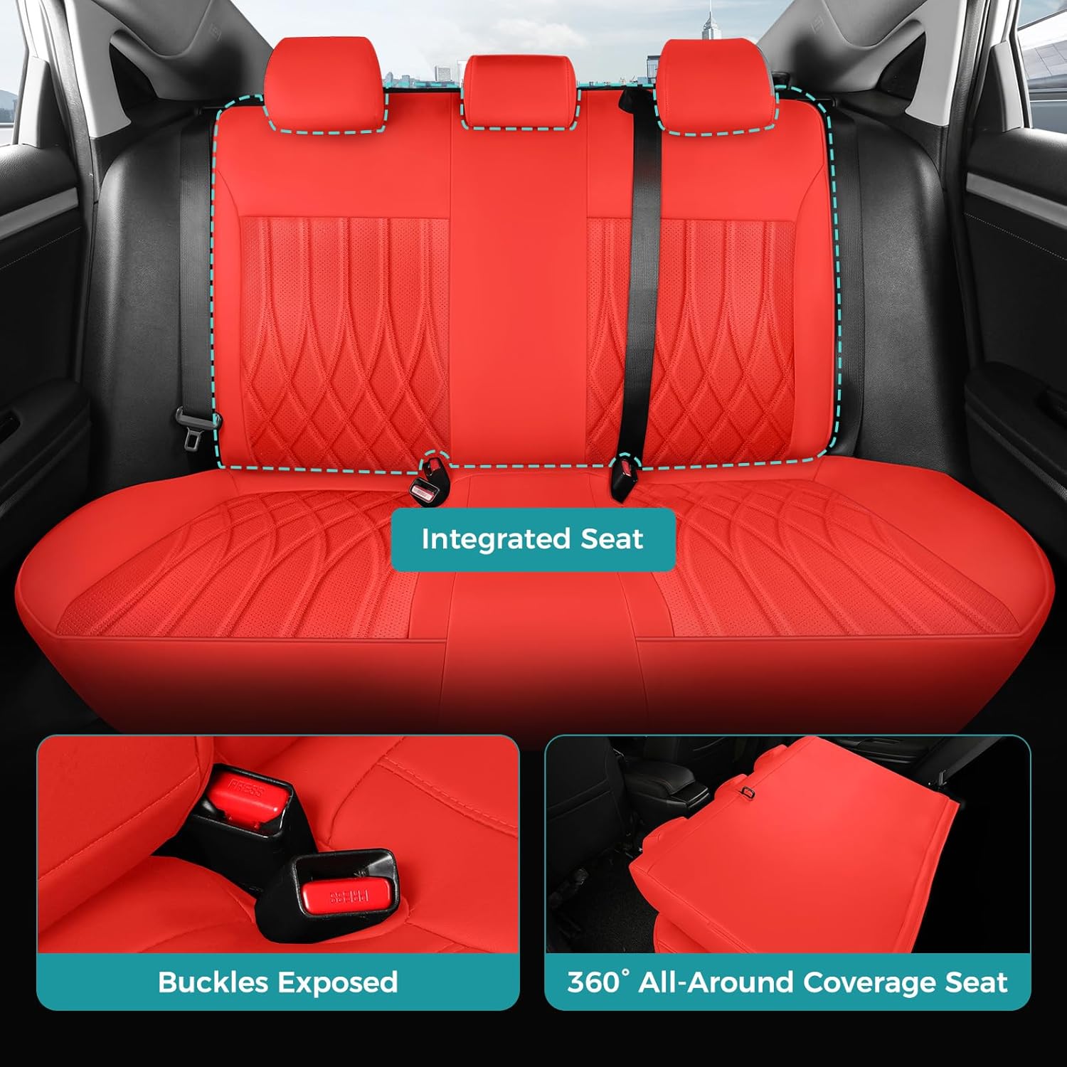 Seat Covers for Honda Civic Sedan LX 2016 2017 2018 2019 2020 2021, Faux Leather Car Seats Cover Full Set (Rear Row Solid & No Folding Backrest)-RED