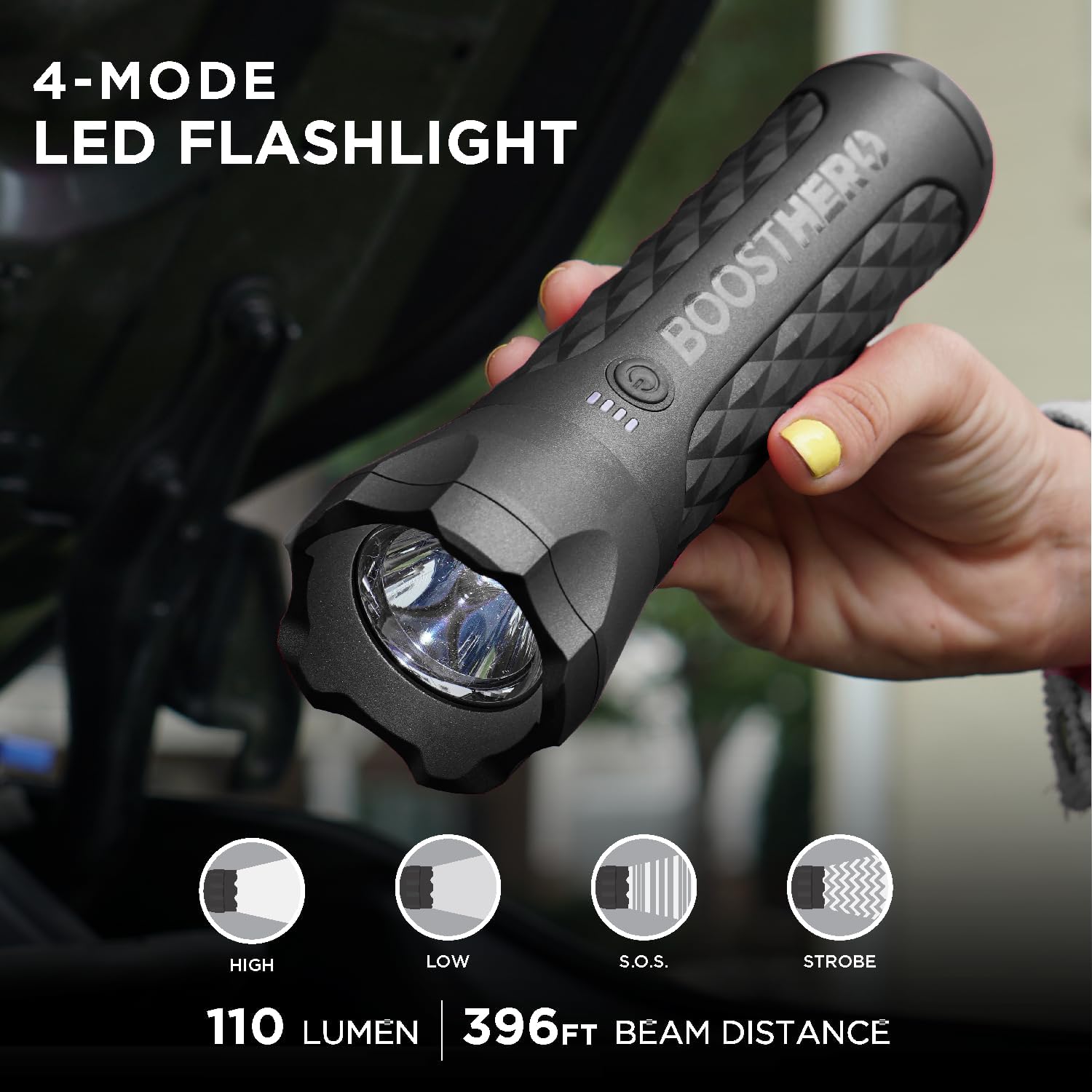 - 4-Mode LED Flashlight - Lightweight 110-Lumen LED Flashlight has 4-Modes (High Beam, Low Beam, S.O.S. & Strobe). 396ft reach is the perfect tool for daily use, traveling, outdoor activities, and in emergency situations.