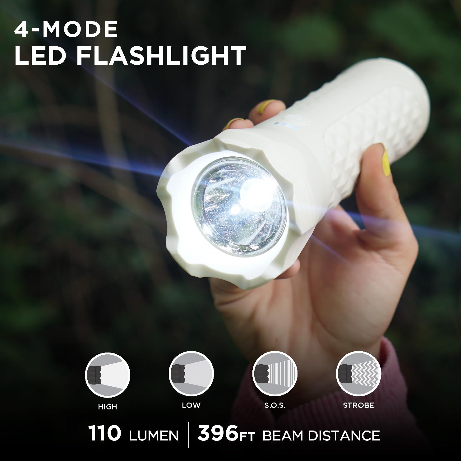 - 4-Mode LED Flashlight - Lightweight 110-Lumen LED Flashlight has 4-Modes (High Beam, Low Beam, S.O.S. & Strobe). 396ft reach is the perfect tool for daily use, traveling, outdoor activities, and in emergency situations.
