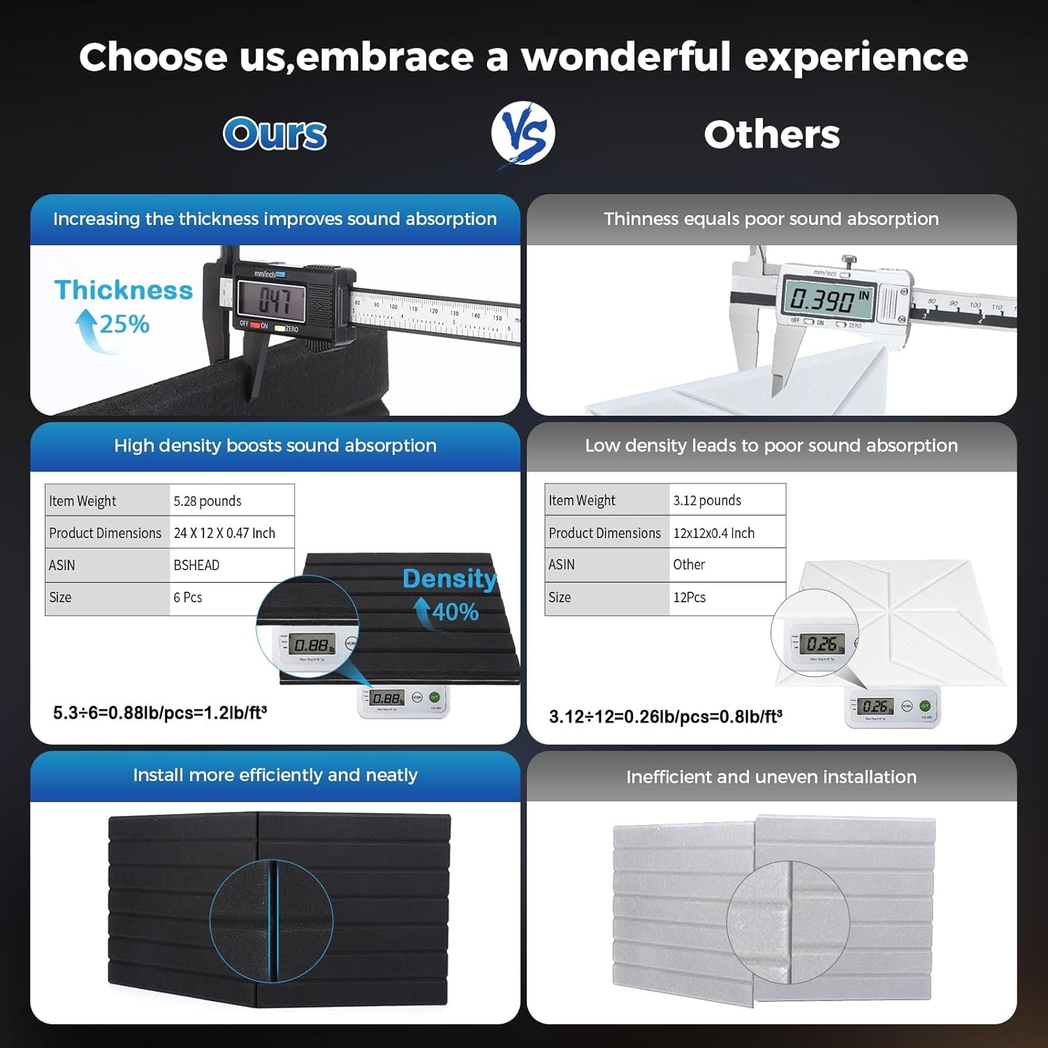 - 【Excellent Quality】: This sound panels is made of high-quality 100% polyester, odorless and flame retardant. There are no risks associated with spending long periods of time in a room with soundproof wall panels. And compared with traditional sound panels noise reducing for walls, our products have higher thickness (25% thicker) and density (35% denser)larger in size(200% area),which means better durability and sound absorption