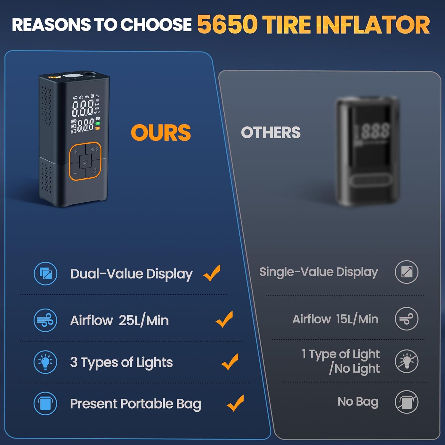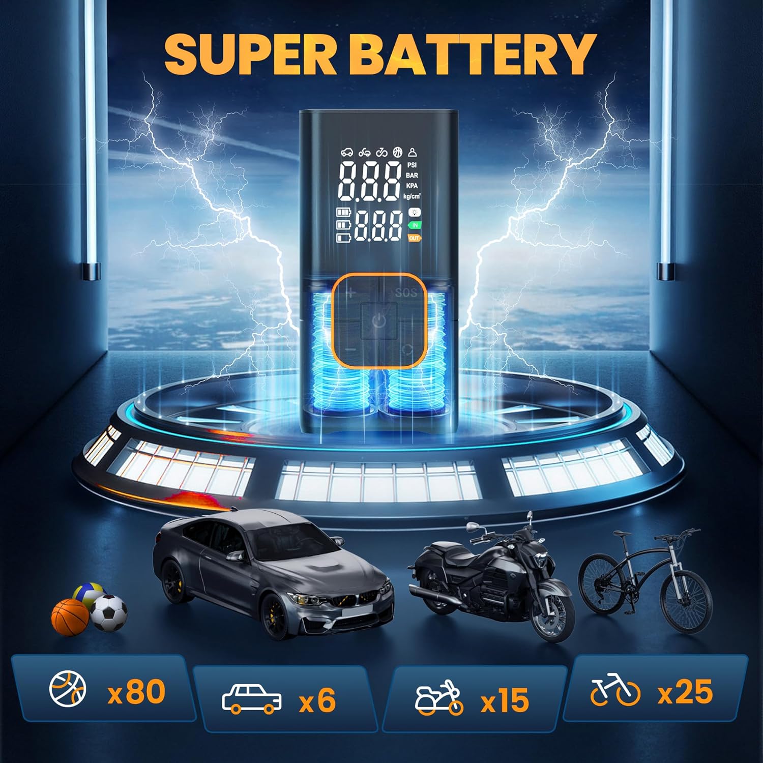 - Tire Inflator - The air compressor is equipped with an advanced sensor that collects more accurate pressure data compared to the market standard. It features a dual-screen real-time display and a preset pressure function. Once the preset pressure is reached, the air compressor automatically stops inflating to prevent over-inflation and ensure optimal performance and safety of the tires