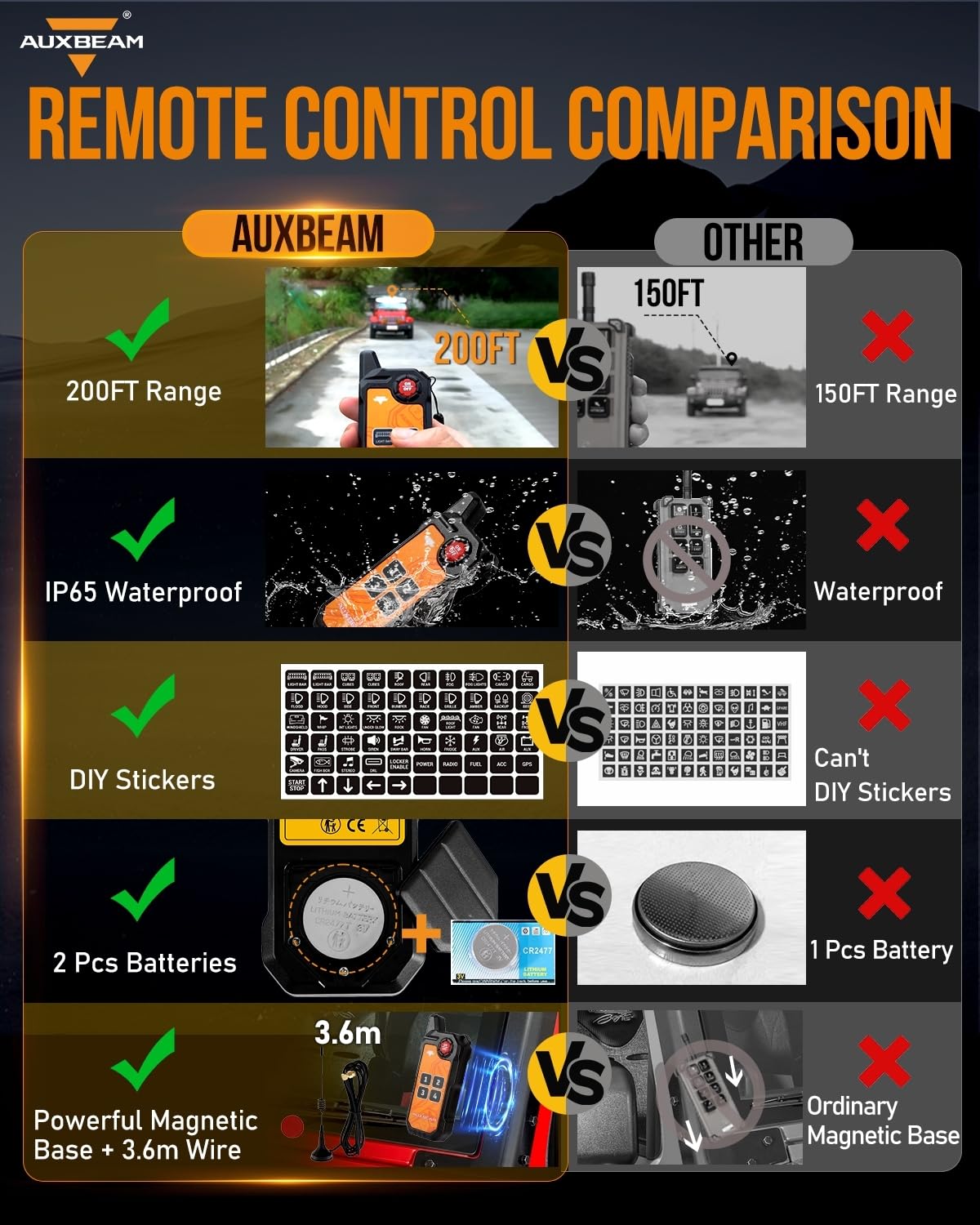 - Upgraded Accessories: AS-400 switch controller upgraded accessories include a circuit box with a built-in solid-state relay, a 60A circuit breaker, fuses, waterproof covers, 60pcs stickers, mounting brackets, and a 10ft wiring harness. Max power: 720~1400W.Temperature range:-40~221°F. 2 years warranty by Auxbeam.