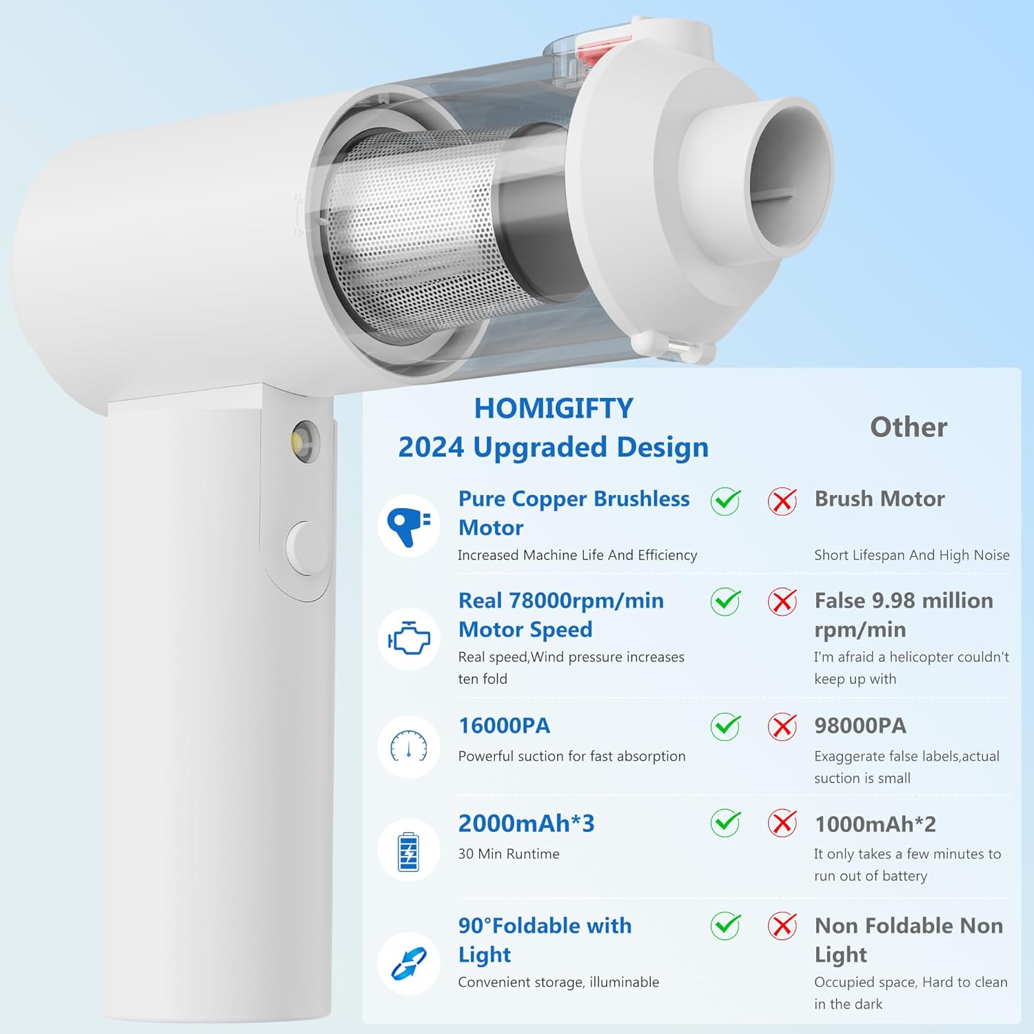 - 【90° Foldable Design】HOMIGIFTY car vacuum features a 90° foldable design, allowing for easy storage without taking up space. Its compact size, paired with a storage bag, makes it perfect for on-the-go cleanups—whether you’re traveling or on a road trip.