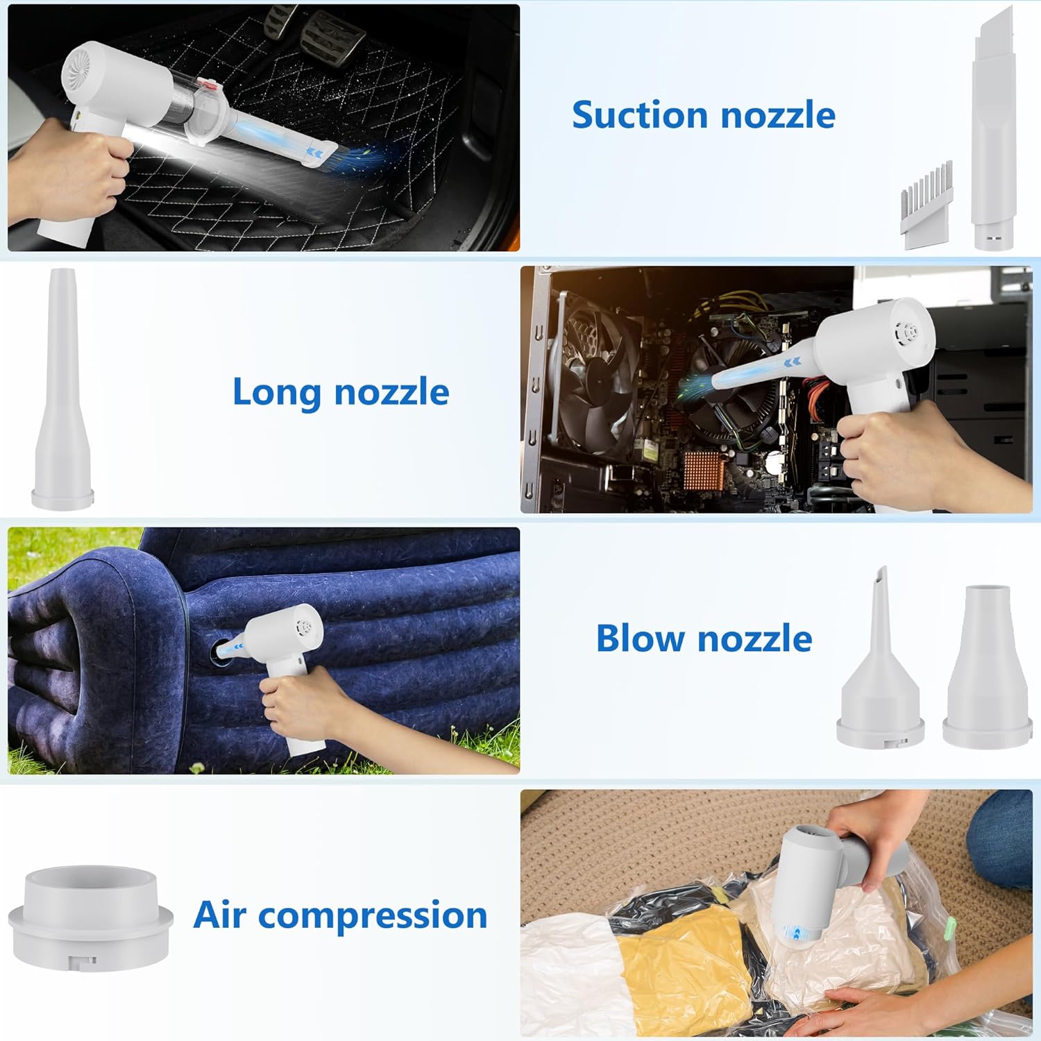 - 【4-in-1 Portable Air Blower/Car Vacuum】This versatile hand vacuum cordless combines vacuuming, blowing, inflating, and pumping functions. Whether you're cleaning hard-to-reach corners of your car, inflating air mattresses, or using the air duster to clean keyboards, this mini vacuum has you covered.